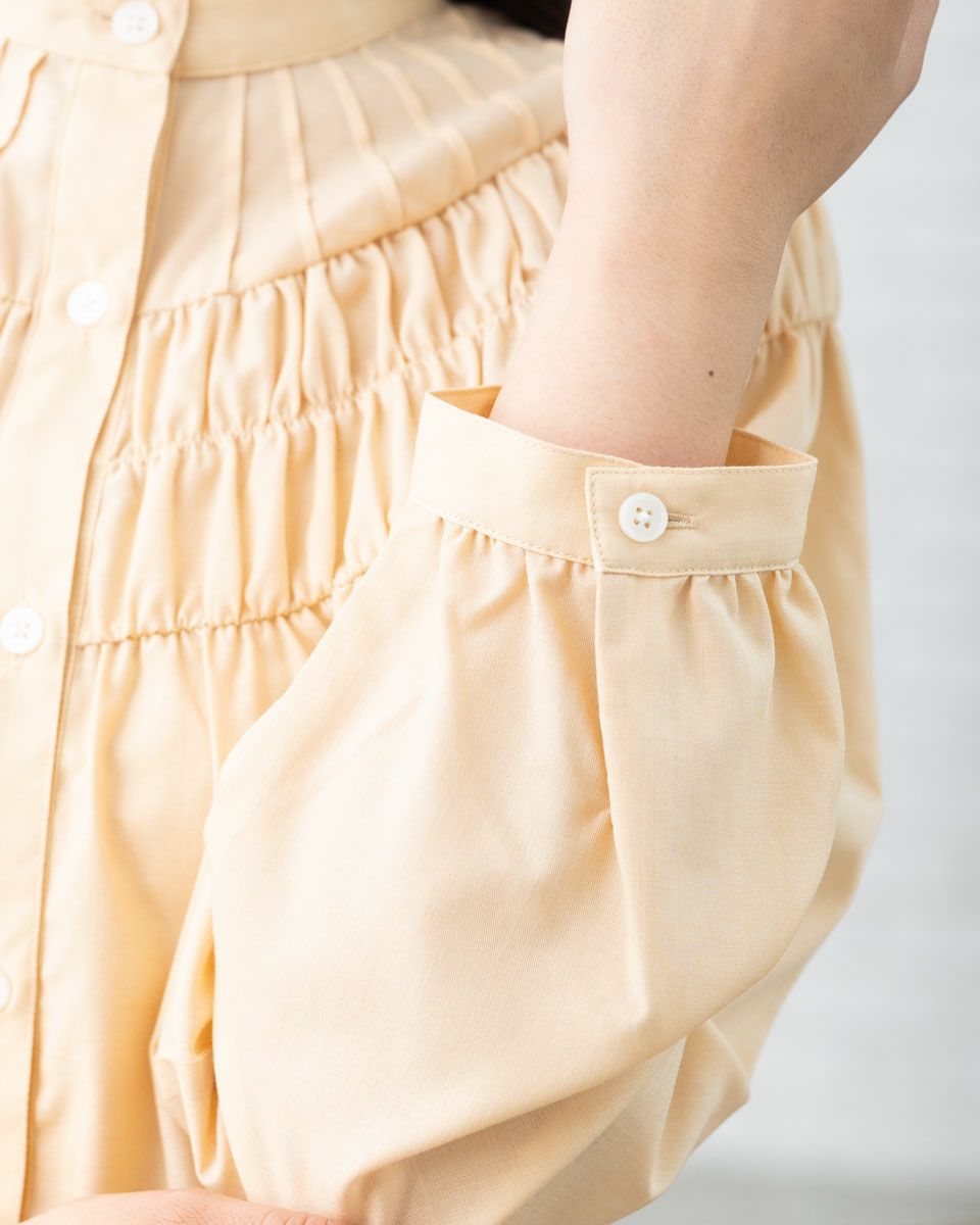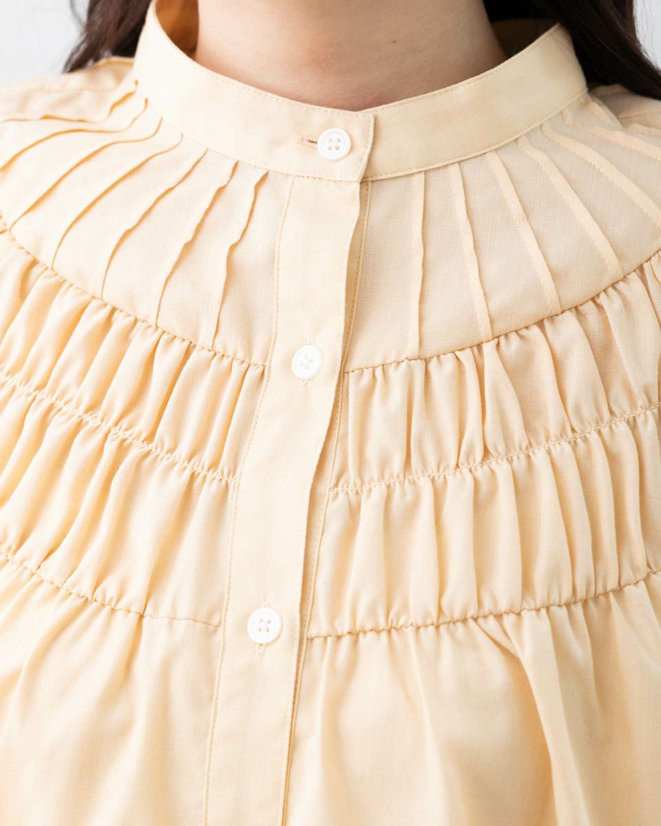 癖が無くプレーンで清潔感のある平織りの生地を使用。ネックから胸上まで半円状に3段に切り替えたパーツにピンタックやギャザーを施した手しごと感が感じられるブラウス。生地が細かく隆起し表情が吹き込まれた上半身が華やかなため首元がスッキリと映るようにバンドカラーにしています。ほのかに透け感があり軽く涼しげなので春夏を通して長くお召しいただけます。腹部やヒップを覆う着丈で便利なアイテム。 モデル身長: 168 cm 着用サイズ: M サイズ Golden Bear White Label (WOMEN) ブラウス (WOMEN) 【着用アイテム】468R4660 バックペプラムプルオーバー 468R3760 ストレートパンツ 468R4760 サスペンダーパンツ