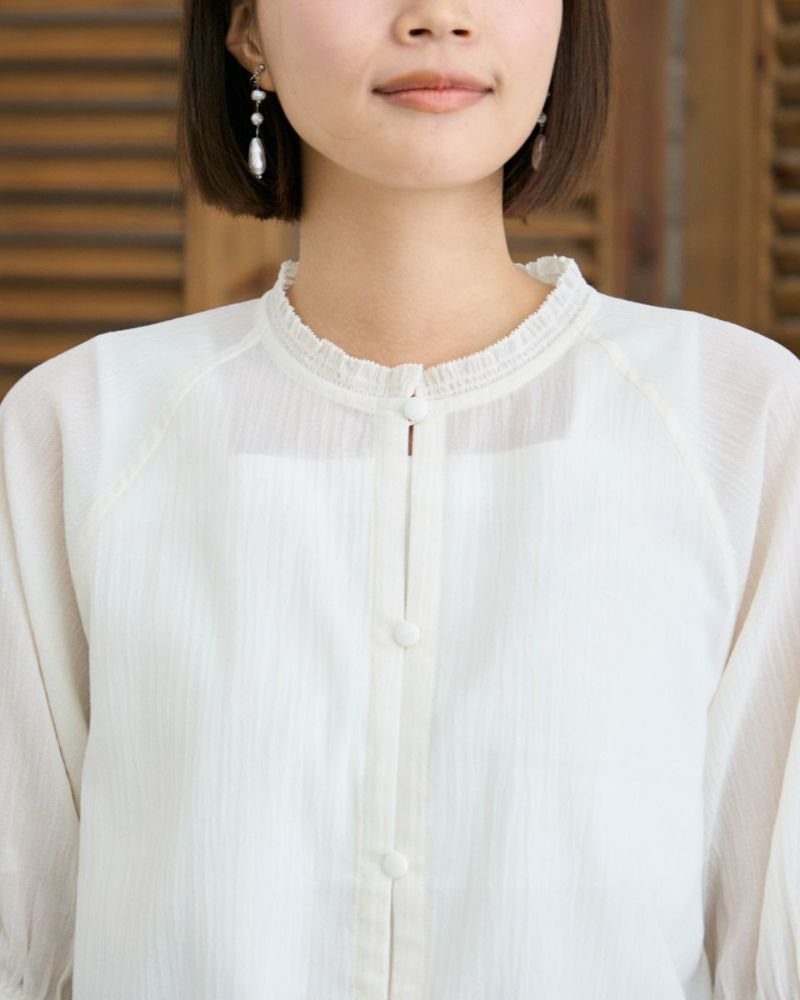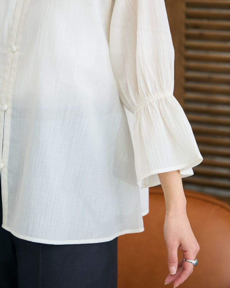 ちりめんのような細かいシボが広がるポリエステル素材を使ったブラウスです。生地の表裏がほのかにゆらぎ、肌との接点が少ないためサラッと涼しくお召しいただけます。フレアの入ったボディと袖口が風になびく様子もフェミニンで全体的にシアー感があるためインナーの着用がおすすめ。シャーリングを寄せた襟がポイントになり1枚着を楽しむ他、冷房や日除け対策の羽織りとしても便利です。
