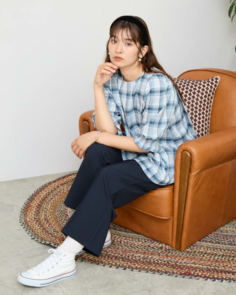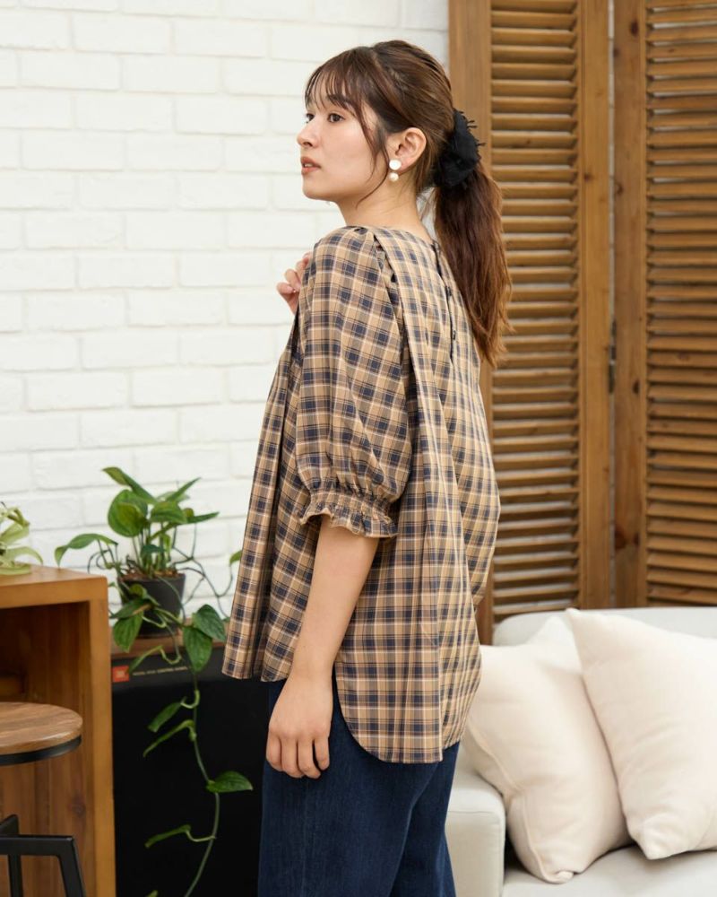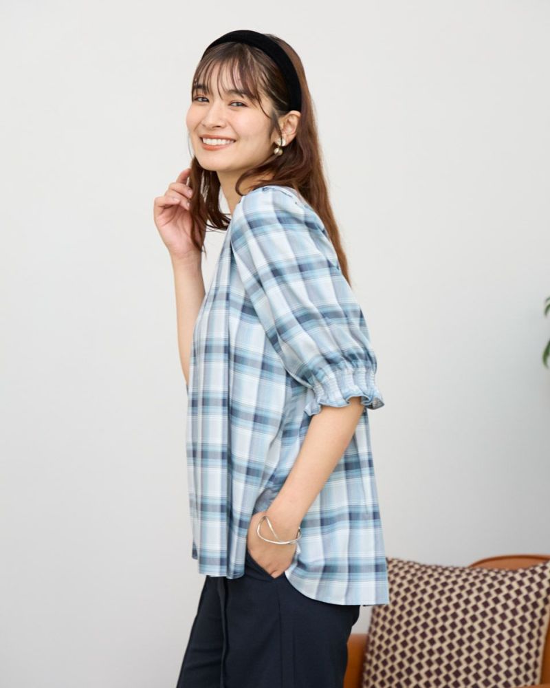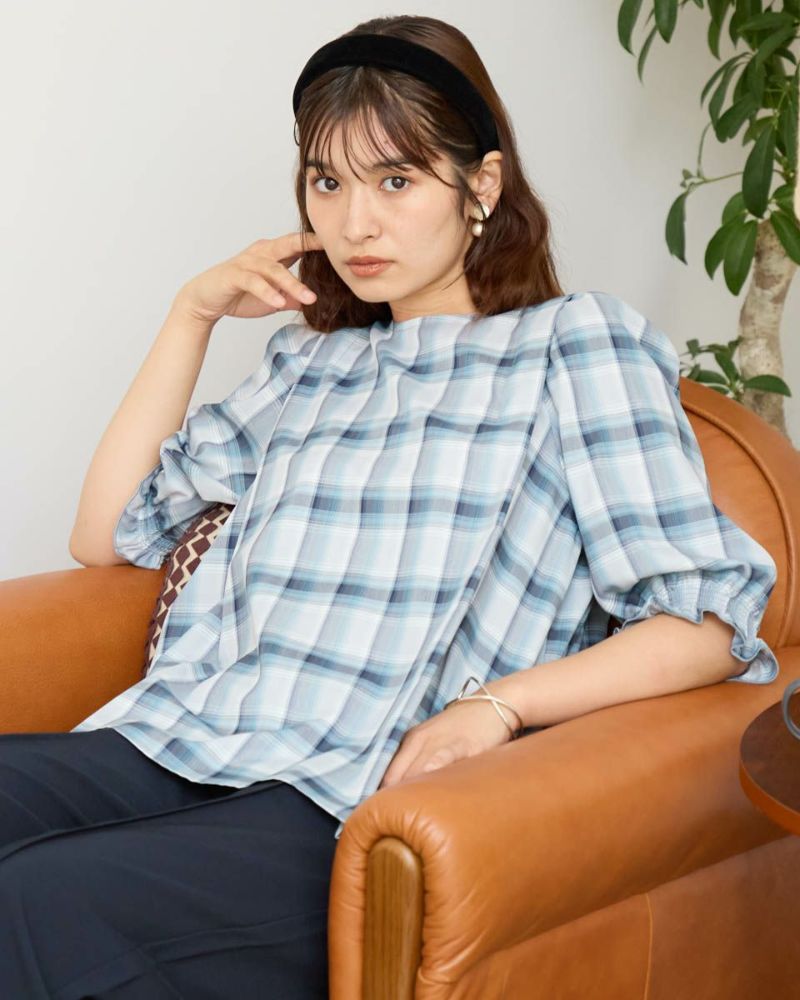 カジュアルな印象のチェック柄をポリエステル・レーヨンを使って表現しました。コットン単体に比べ強張りが少なく、しなやかに身体を包む様子も魅力。ほのかにツヤ感がありタックで揺れる裾や膨らみを付けた袖も幼さが消え着用しやすいです。パンツとバランスが取りやすくスラックスと合わせたオフィススタイルも素敵です。カーブパンツやデニムとのカジュアルコーディネートではジュエリーやキャップで辛口に仕上げると甘さのあるディティールが活きるのでおすすめ。キャメルベースのタータン調チェックと、グレ-をベースに滲んだような柔らかい雰囲気が特徴のオンブレチェックの展開で色みが深まる初秋にも着用が可能です。