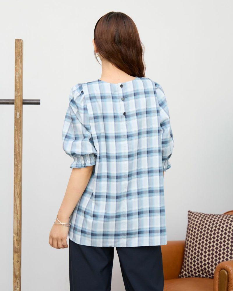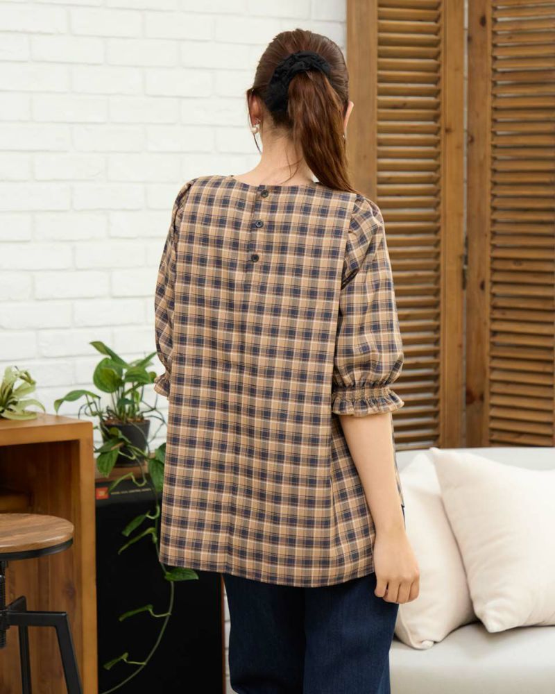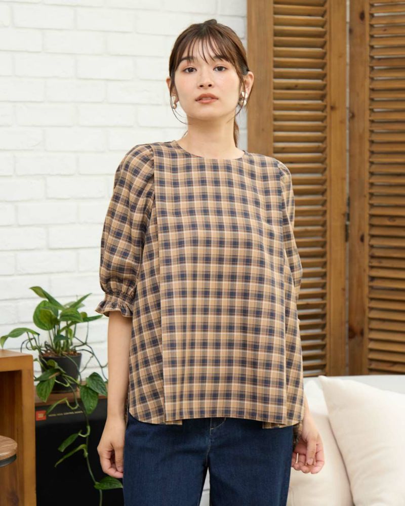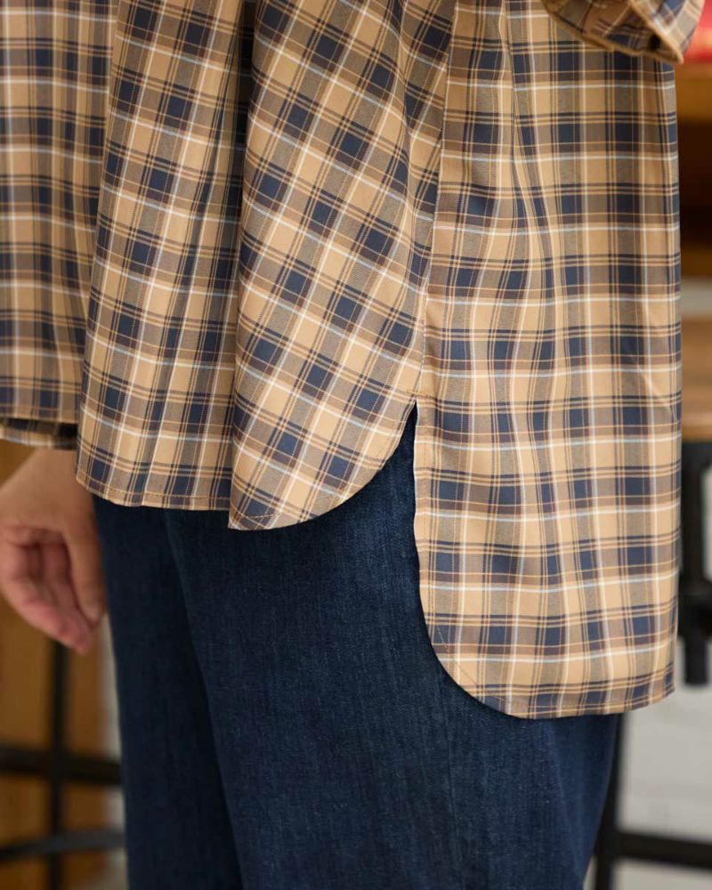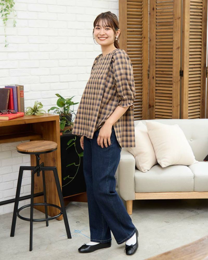 カジュアルな印象のチェック柄をポリエステル・レーヨンを使って表現しました。コットン単体に比べ強張りが少なく、しなやかに身体を包む様子も魅力。ほのかにツヤ感がありタックで揺れる裾や膨らみを付けた袖も幼さが消え着用しやすいです。パンツとバランスが取りやすくスラックスと合わせたオフィススタイルも素敵です。カーブパンツやデニムとのカジュアルコーディネートではジュエリーやキャップで辛口に仕上げると甘さのあるディティールが活きるのでおすすめ。キャメルベースのタータン調チェックと、グレ-をベースに滲んだような柔らかい雰囲気が特徴のオンブレチェックの展開で色みが深まる初秋にも着用が可能です。