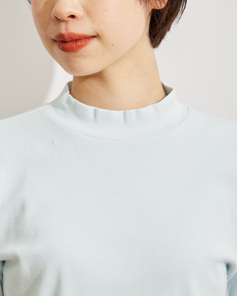 薄手のテレコ素材で作ったハイネックのトップス。軽くて薄いので季節の変わり目のインナーにおすすめ。顔まわりを明るく見せてくれるカラーがコーディネートのポイントになってくれます。