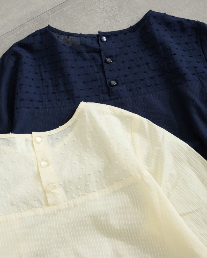 綿100%の水玉状にカットしたドビー素材と立体感の有るコードストライプを接ぎ合わせたブラウスです。