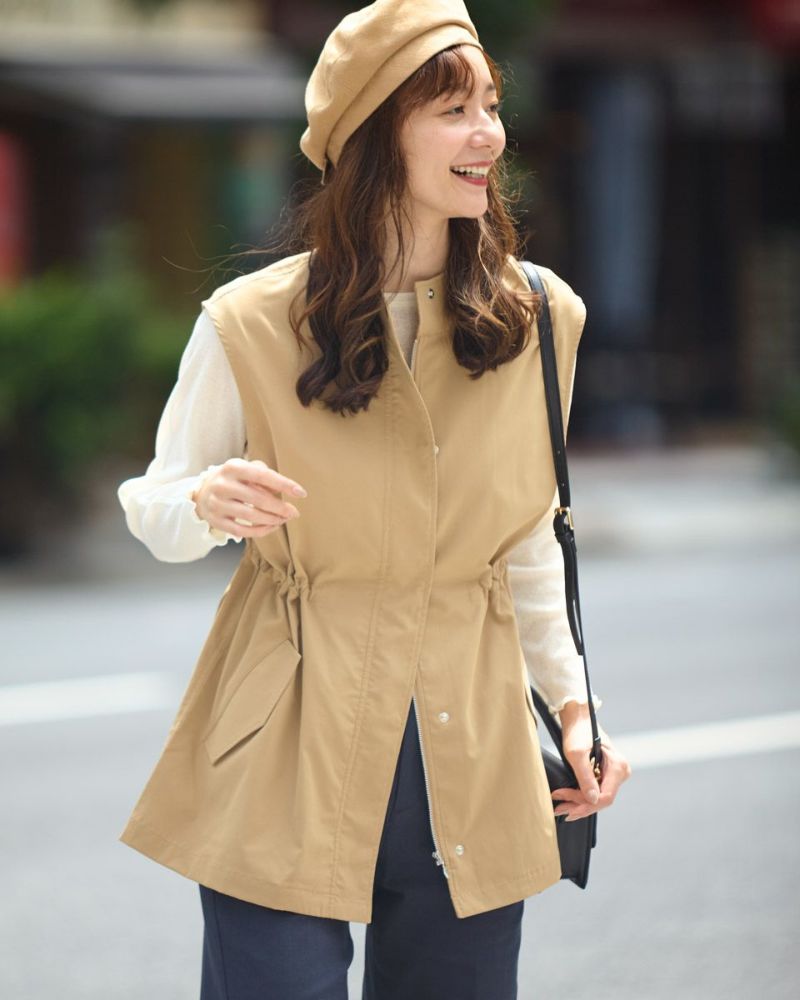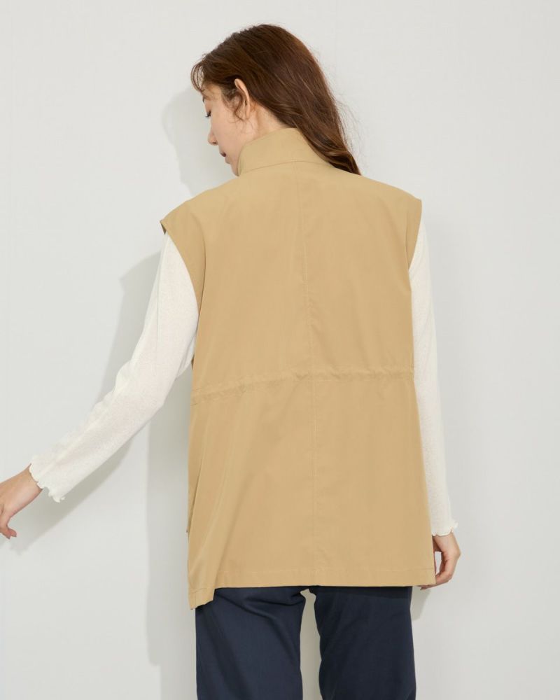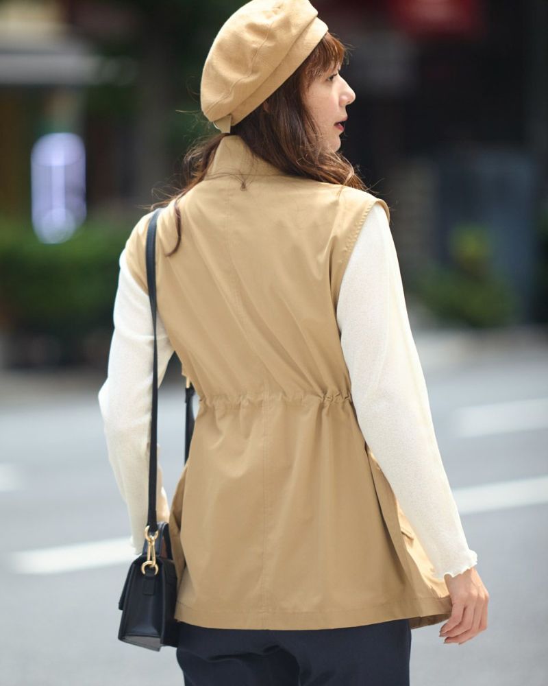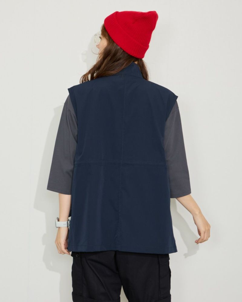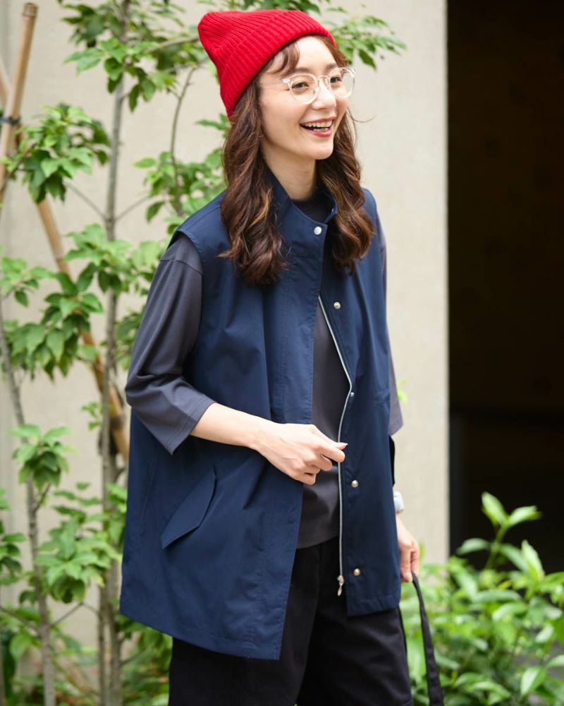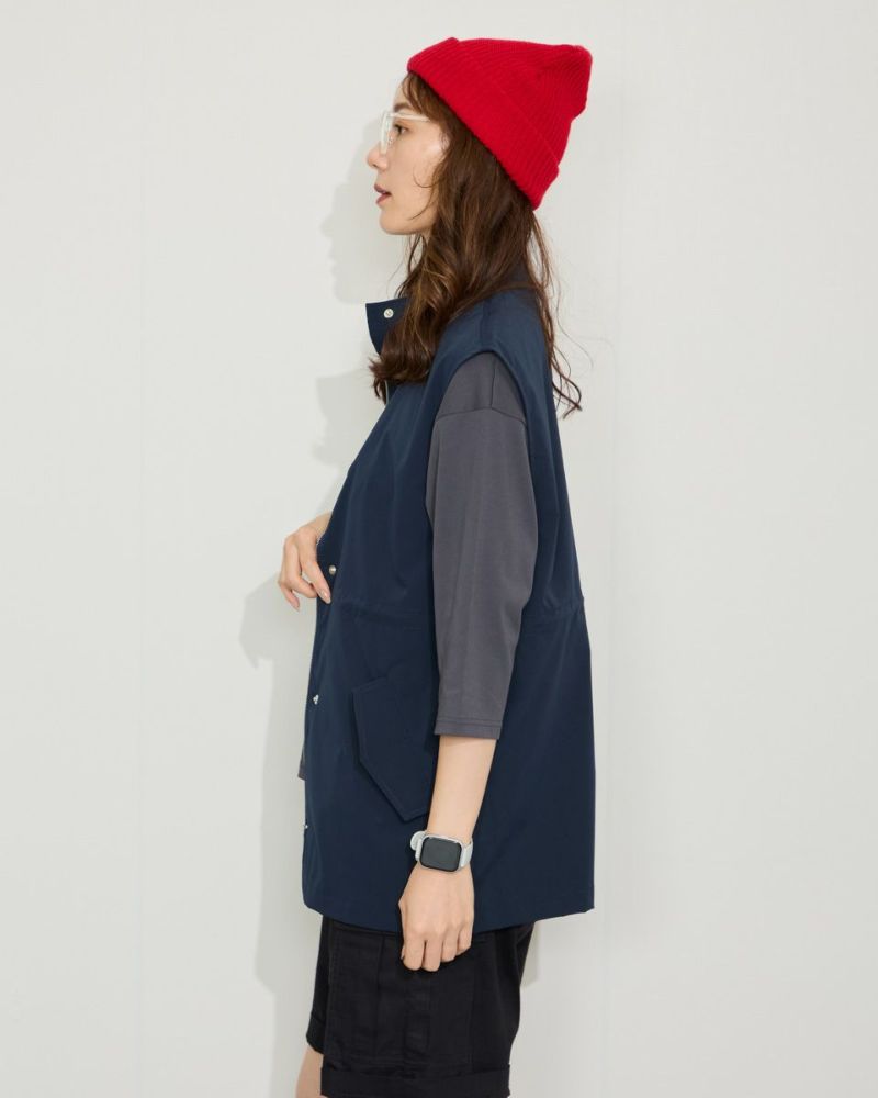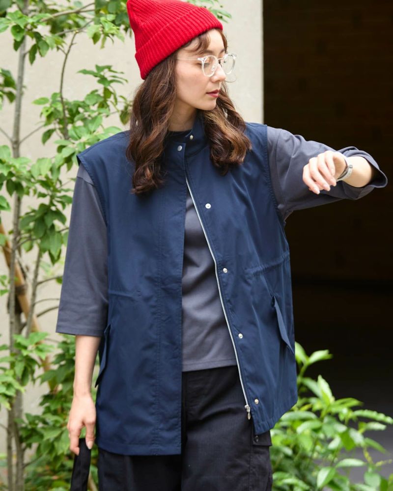 レイヤードスタイルに欠かせない布帛ベストです。Tシャツやシャツに重ねるだけでこなれ感がアップします。ドロストで動きもつけられ、メリハリシルエットで女性らしく着こなせます。 モデル身長: 171 cm 着用サイズ: M サイズ Golden Bear Ladies' アウター (Ladies') 【着用アイテム】467QB402 七分袖GB天竺Tシャツ 467QB413 テレコTシャツ 467QB712 折山プレスストレートパンツ