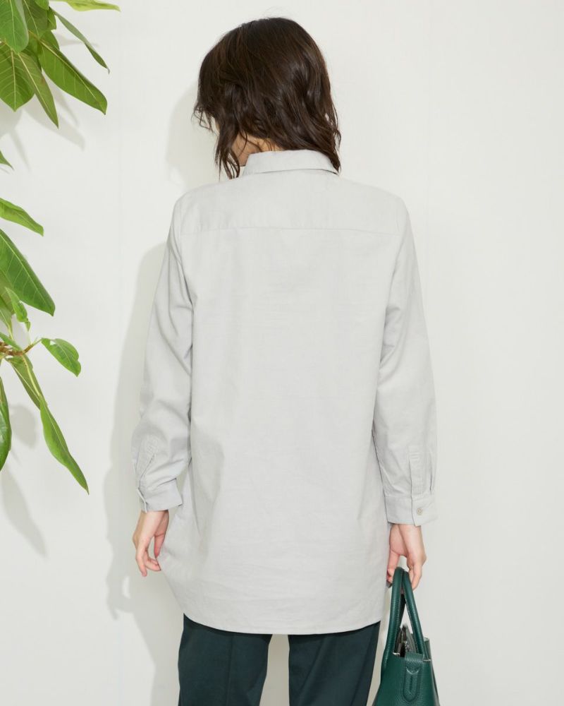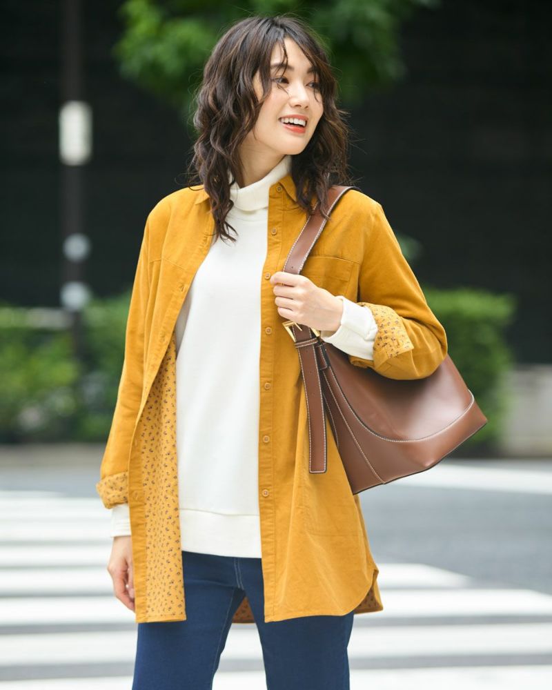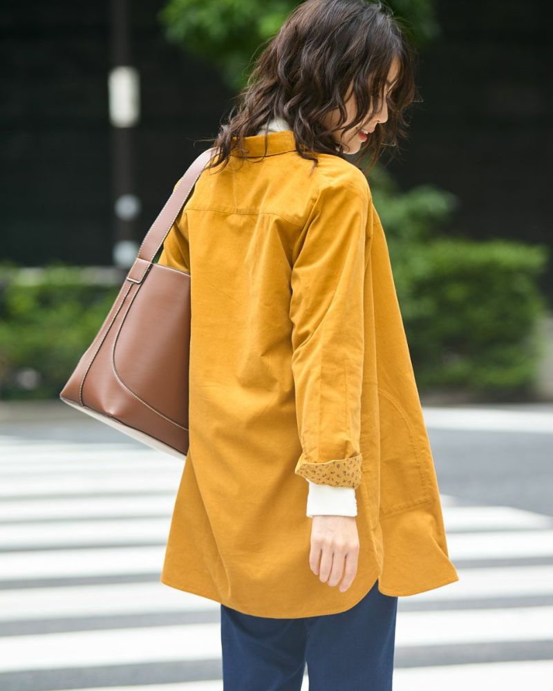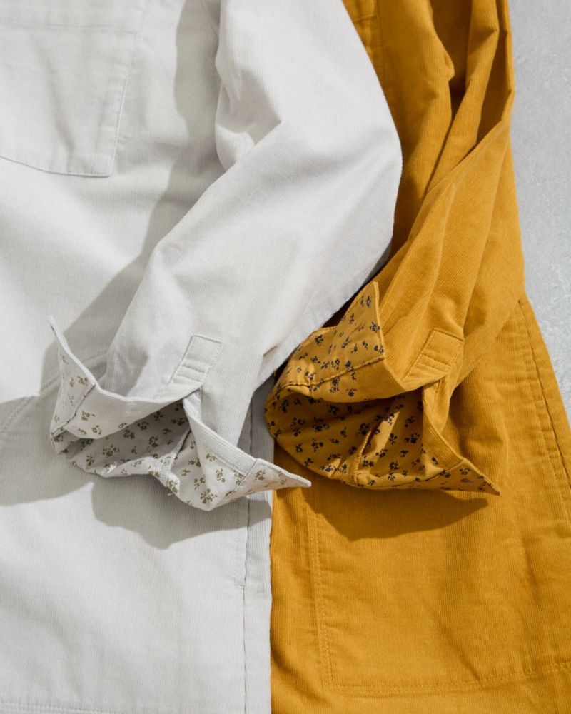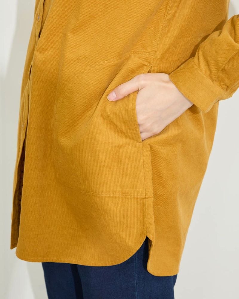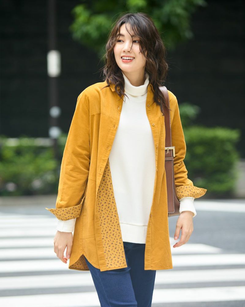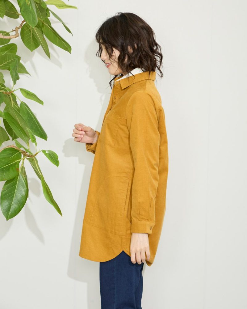 コーデュロイの裏に小花プリントをした生地を使用した前開きチュニックです。台襟付きシャツ襟で左胸と両脇にポケットが有ります。一枚着、又は羽織としても着用いただけます。色はライトグレーとイエローの2色展開で釦付け糸を配色にしています。