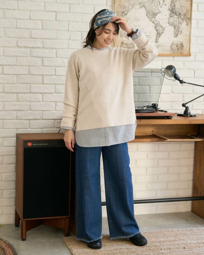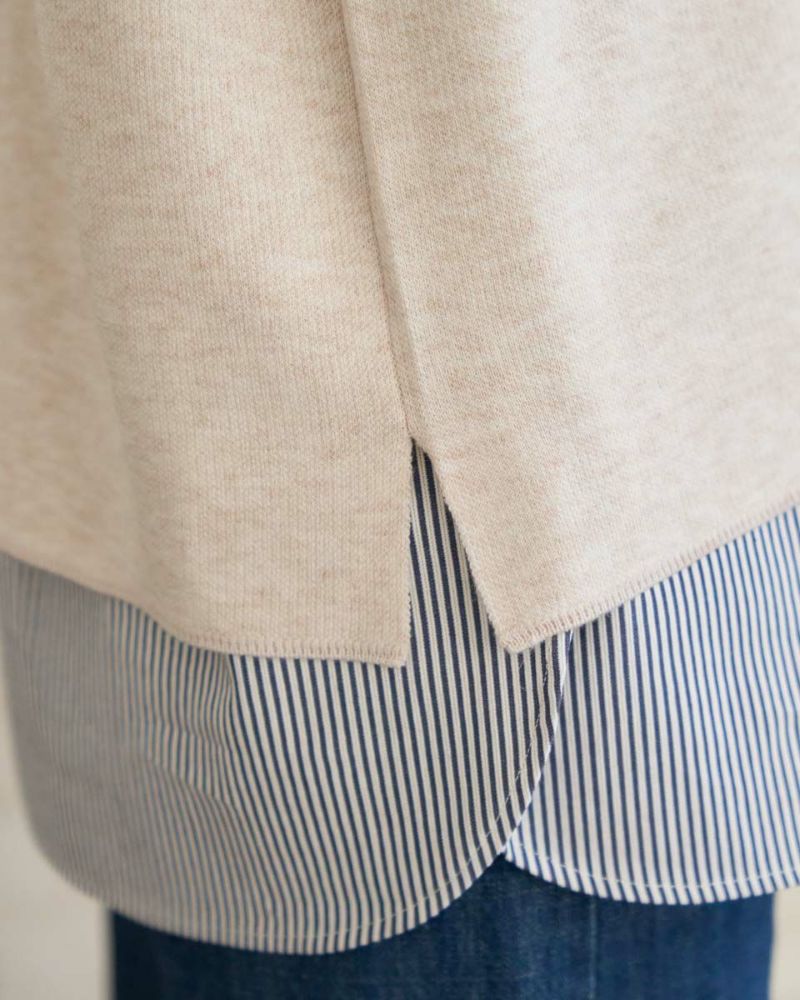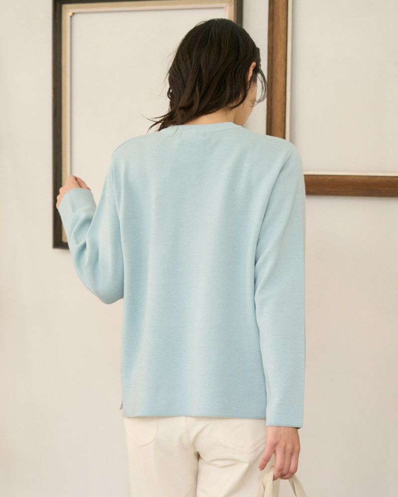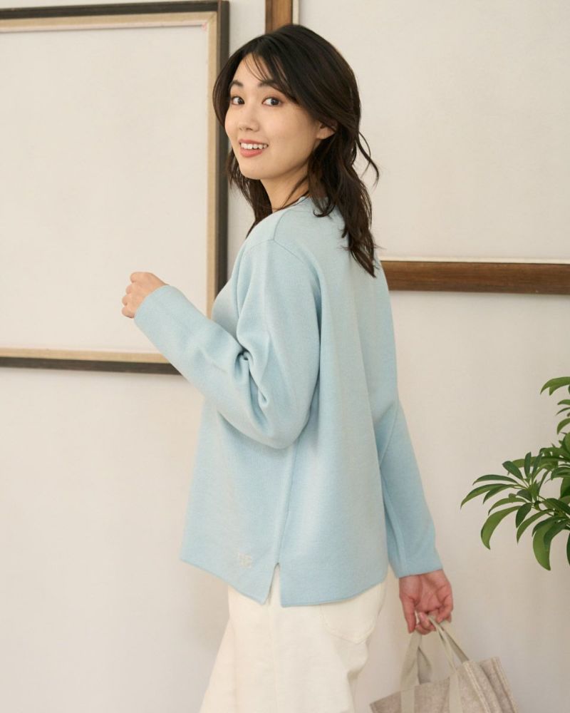軽さのあるダブルジャカードでカジュアルながらもニットの上品さを兼ねそなえたアイテムです。左下にGBのロゴを入れてポイントにしました。柔らかな色が女性らしく着用できる1枚です。 モデル身長: 166 cm 着用サイズ: M サイズ Golden Bear Ladies' ニット (Ladies') 【着用アイテム】467R1340 シャツ 467QE702 ストレートパンツ 468QD050 トートバッグ