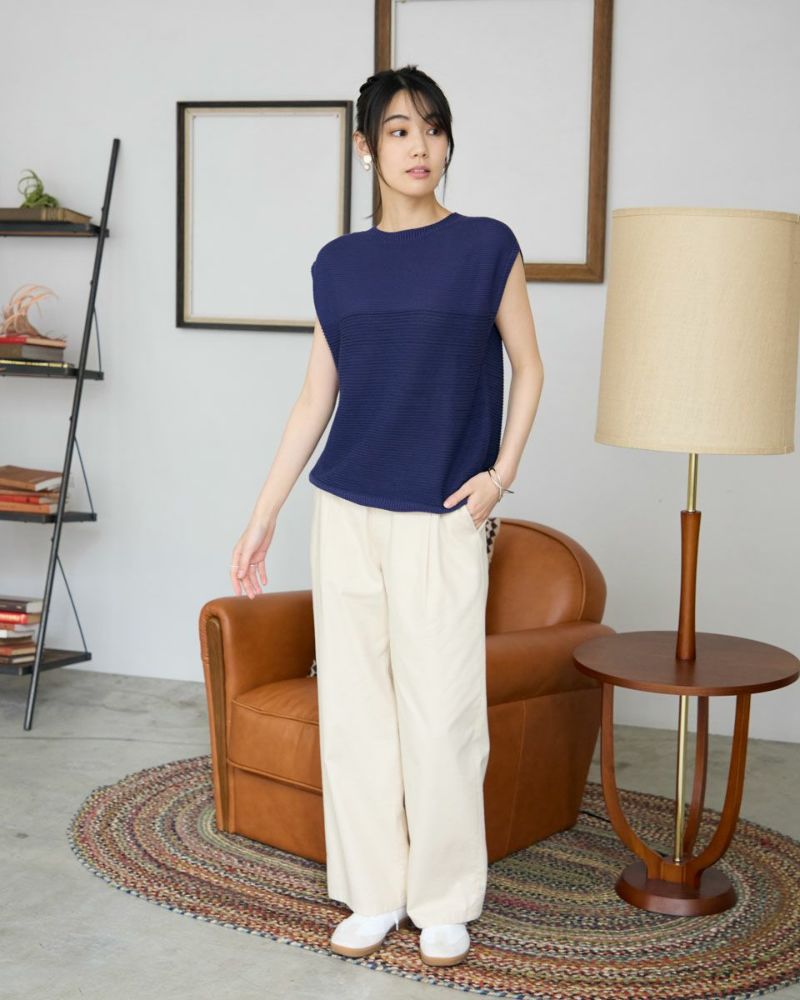 WHOLEGARMENTで編み上げたニットベストです。ガーターの編みに強弱をつけ表情ある1枚に仕上げています。レイヤードスタイルはもちろん、1枚でノースリーブとしての着用もおすすめです。 モデル身長: 166 cm 着用サイズ: M サイズ Golden Bear Ladies' ニット (Ladies') 【着用アイテム】468R3760 ストレートパンツ 468R4760 サスペンダーパンツ