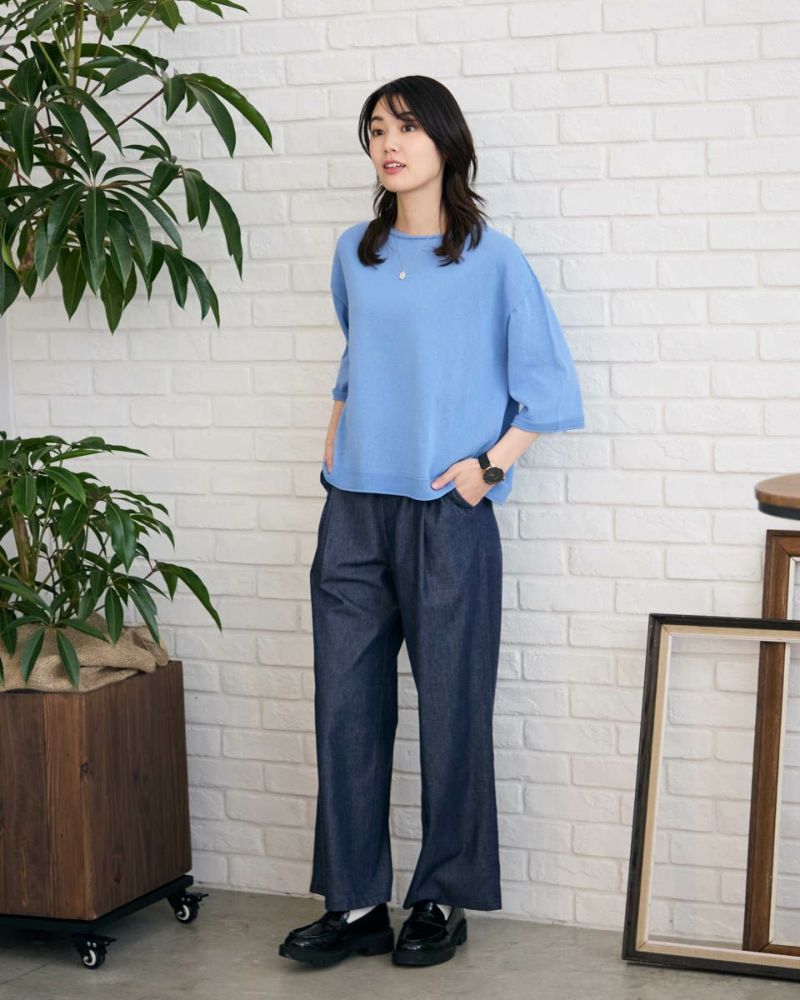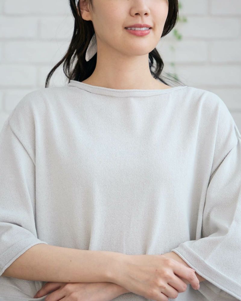 和紙とポリエステルの糸を使用しホールガーメントで編んだプルオーバーです。清涼感ある凹凸感をお楽しみいただけます。触り心地はサラサラしていて張りがあり、強度も高くしっかりした編み上がりのニットです。 モデル身長: 166 cm 着用サイズ: M サイズ Golden Bear Ladies' ニット (Ladies') 【着用アイテム】467R4701 ガウチョパンツ 468R3760 ストレートパンツ