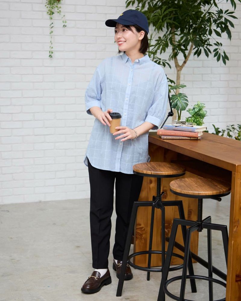 オーガニックコットンを使用した透け感のある素材を使用したブラウスです。少しオーバーサイズのサイジングは夏にぴったりです。 モデル身長: 162 cm 着用サイズ: M サイズ Golden Bear Ladies' ブラウス (Ladies') 【着用アイテム】468R6353 ドッキングワンピース