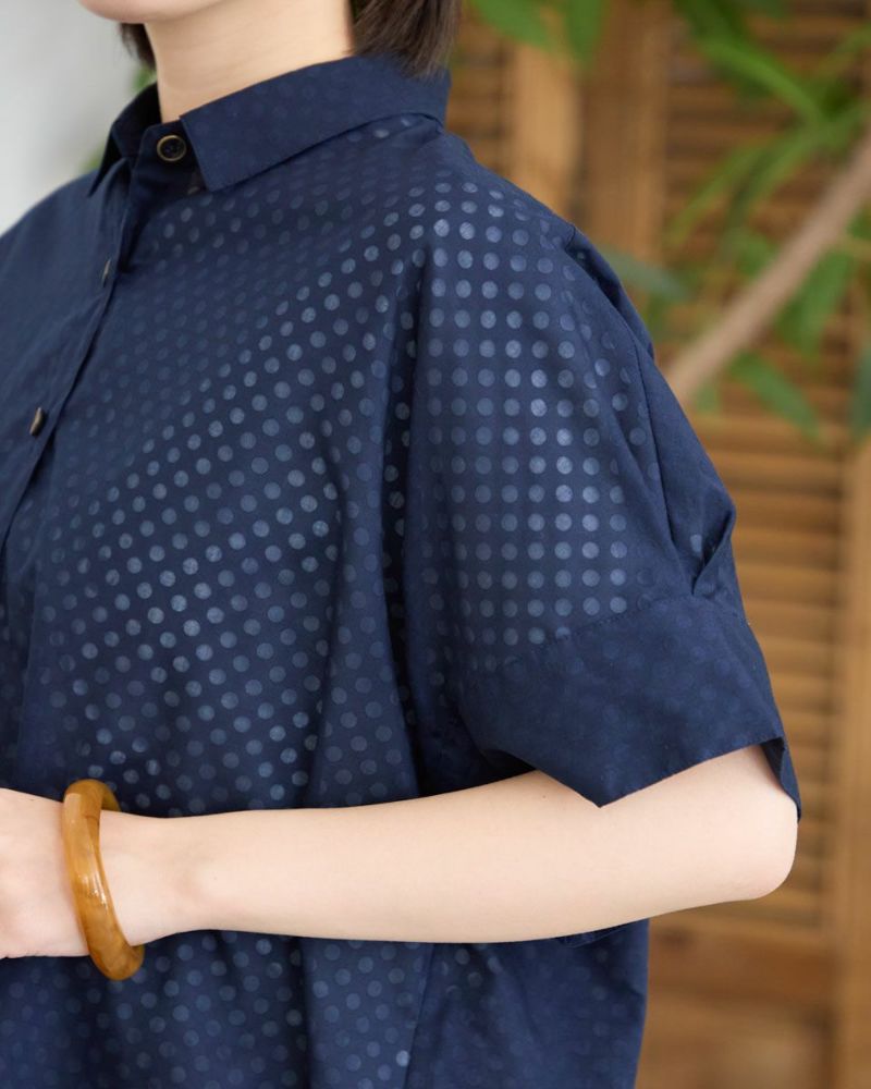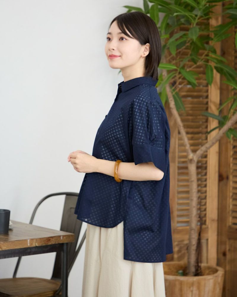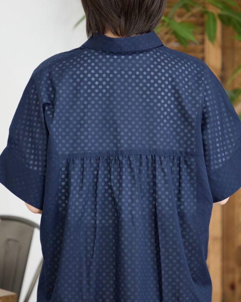 水玉柄にオパール加工した綿ポリエステル素材のブラウスです。(オパール加工とは薬品で繊維の糸を溶かし透かし模様を作る加工のこと)身頃は分量をゆったりととり、袖は五分丈のドルマンスリーブになります。台襟付きシャツカラーで前開きのデザインなので羽織としても着用頂けます。裾は前後差をつけ、前の両脇はラウンドせさせて、後ろは直線のスリットにしています。色はアイボリーとネイビーの2色展開になります。