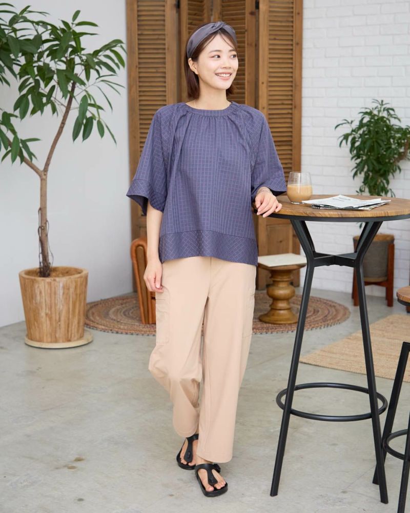 スモックタイプのブラウスです。襟元はゴムの仕様で簡単に着用いただけます。ボトムとバランスがとりやすい短めな着丈です。織りと配色でチェックを表現。さりげない中に存在感のある素材となっています。 モデル身長: 167 cm 着用サイズ: M サイズ Golden Bear Ladies' ブラウス (Ladies') 【着用アイテム】467R7711 ストレートカーゴパンツ 467R8702 セミワイドパンツ