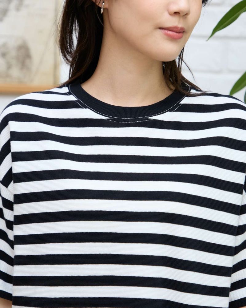環境にも肌にも優しい着心地のオーガニックコットンを使用したTシャツ。表面に変化のあるリップル素材を採用しており、独特の風合いと立体感が楽しめます。シンプルながらも存在感のあるデザインで、カジュアルすぎないボーダーTです。袖丈を長めに作ったのでスタイルカバーができます。