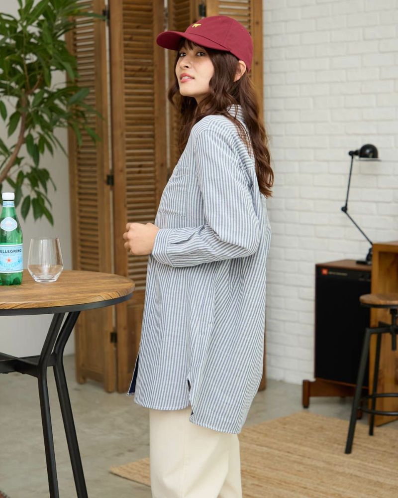 オーガニックコットン100%のふんわりとした膨らみ感が特徴のWガーゼ素材を使用したストライプ柄のシャツです。風合いが柔らかく肌触りの良い素材で一枚着としても夏の羽織物としても着用頂けます。左胸のポケットに枠くま刺繍を入れています。