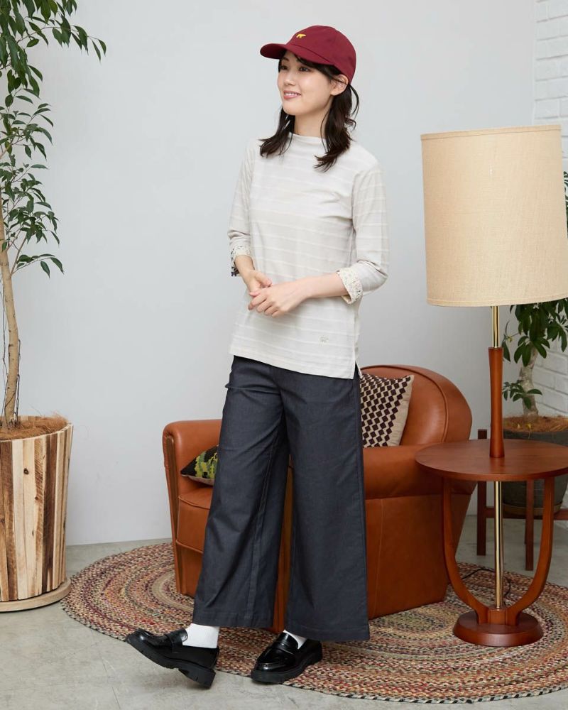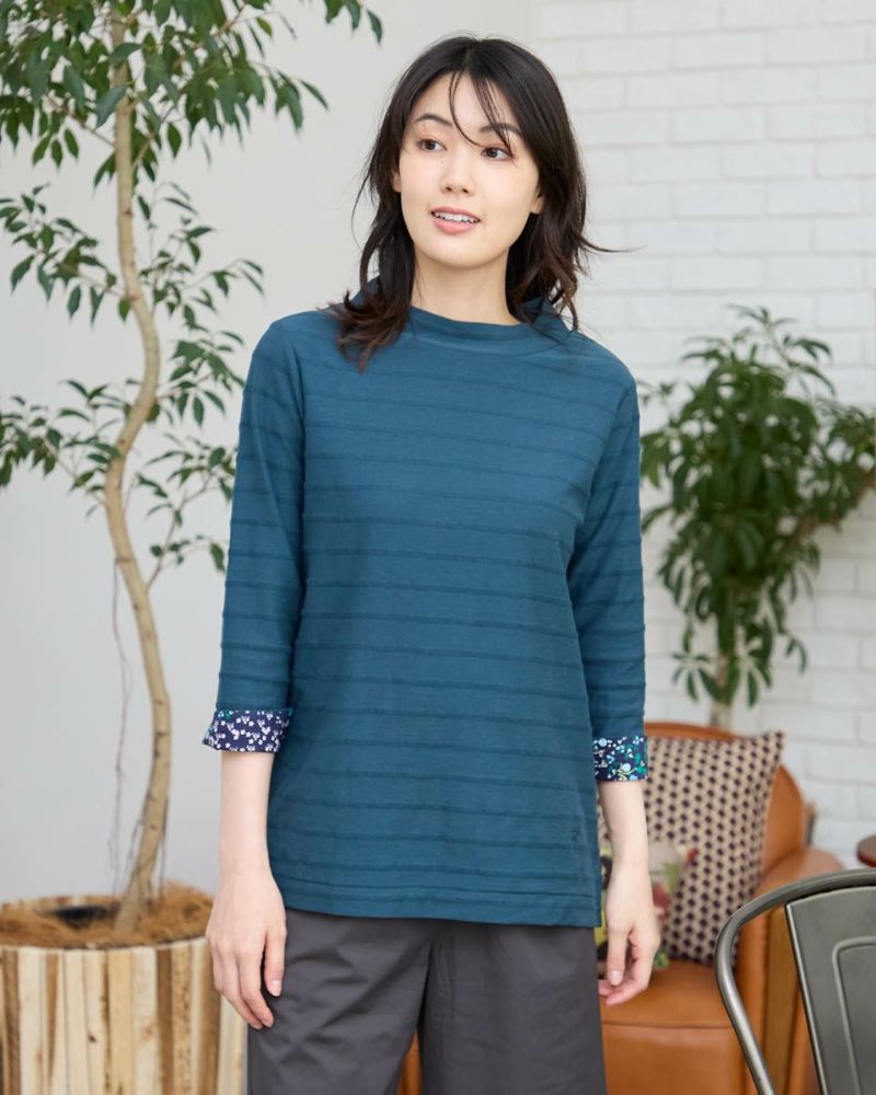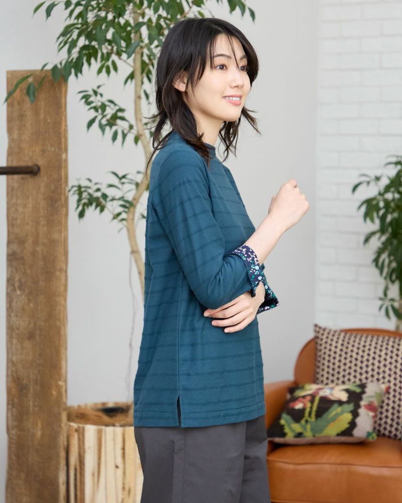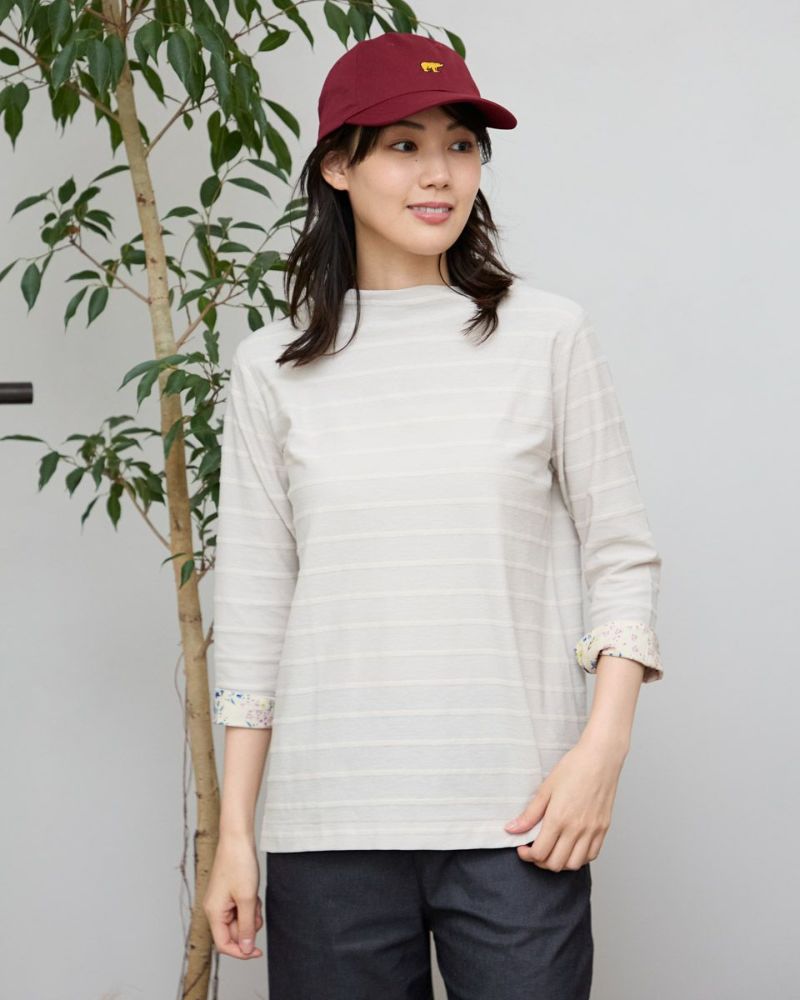 編み柄でボーダーを表現したトップスです。襟が高めなので羽織やカーディガンのインナーとしても使いやすいデザインです。折り返した際に見える袖口裏の花柄がポイントです。 モデル身長: 166 cm 着用サイズ: M サイズ Golden Bear Ladies' カットソー (Ladies') 【着用アイテム】467R8711 ガウチョパンツ 467R8720 ガウチョパンツ