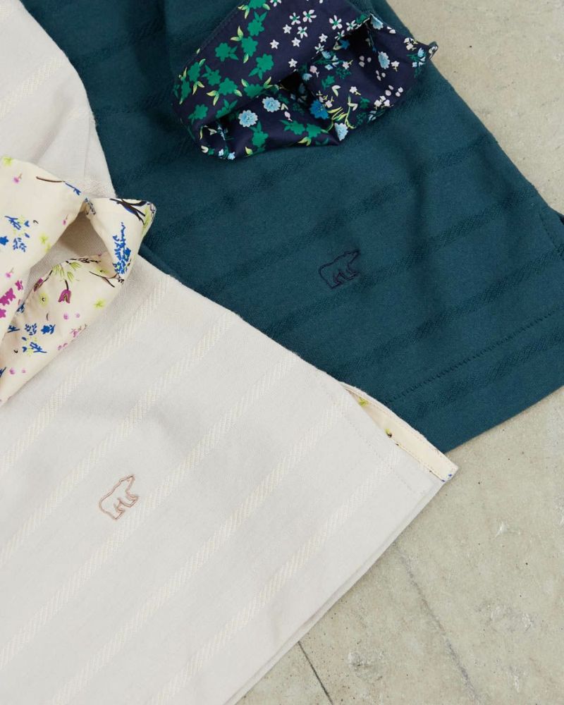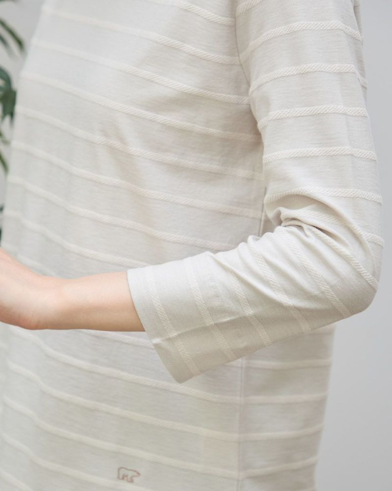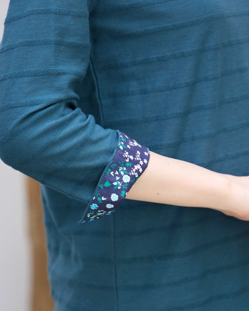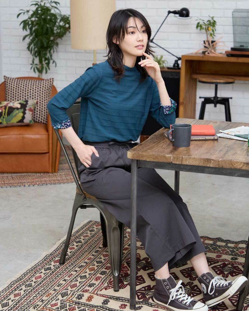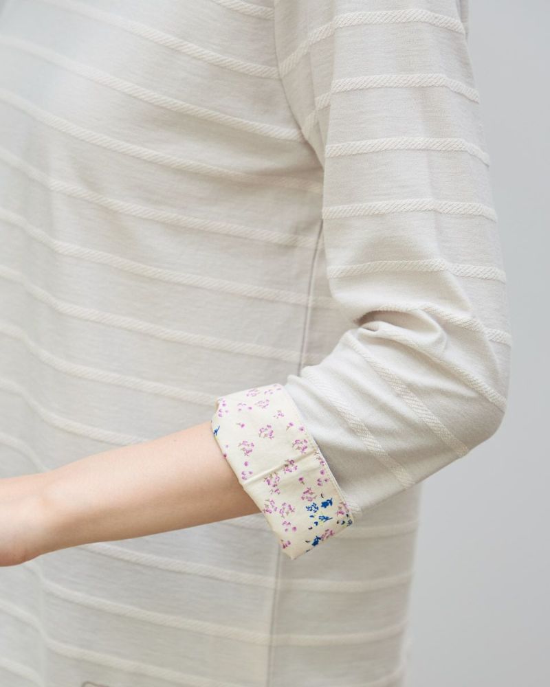 編み柄でボーダーを表現したトップスです。襟が高めなので羽織やカーディガンのインナーとしても使いやすいデザインです。折り返した際に見える袖口裏の花柄がポイントです。 モデル身長: 166 cm 着用サイズ: M サイズ Golden Bear Ladies' カットソー (Ladies') 【着用アイテム】467R8711 ガウチョパンツ 467R8720 ガウチョパンツ