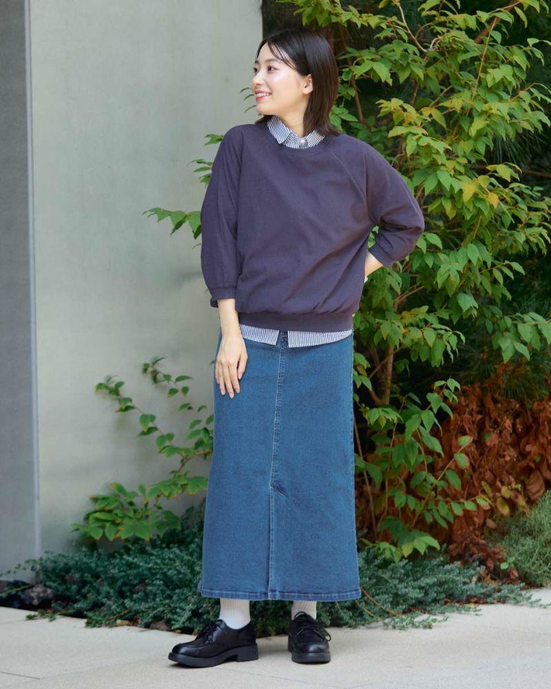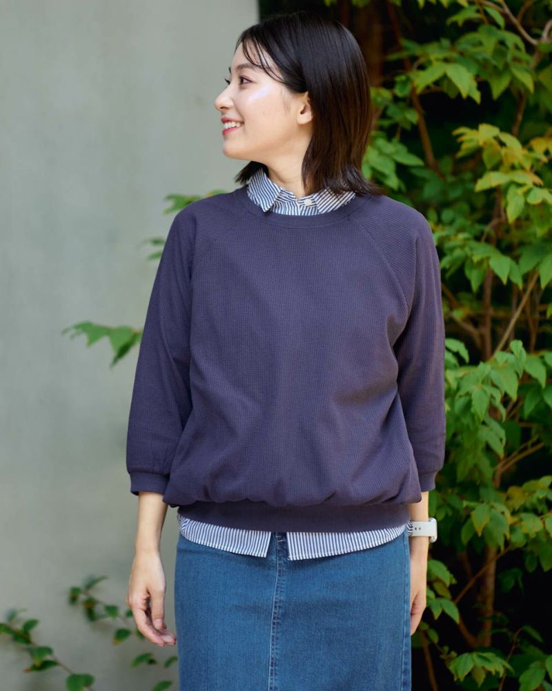 軽くてさらっとしたドライタッチのワッフル素材のTシャツ。5分袖とゆったりしたボリュームシルエットで、動きやすくリラックスした着心地です。肌離れが良く、汗ばむ季節でも快適に過ごせる一枚。 モデル身長: 162 cm 着用サイズ: M サイズ Golden Bear Ladies' カットソー (Ladies') 【着用アイテム】467RC712 デニムAラインスカート 467R8010 花柄ストール