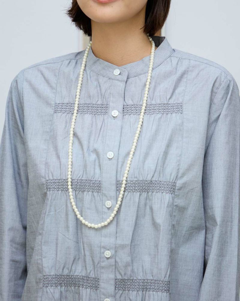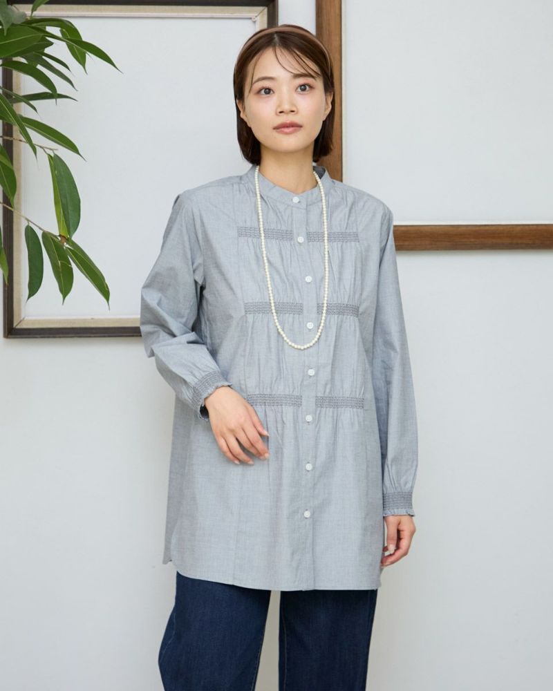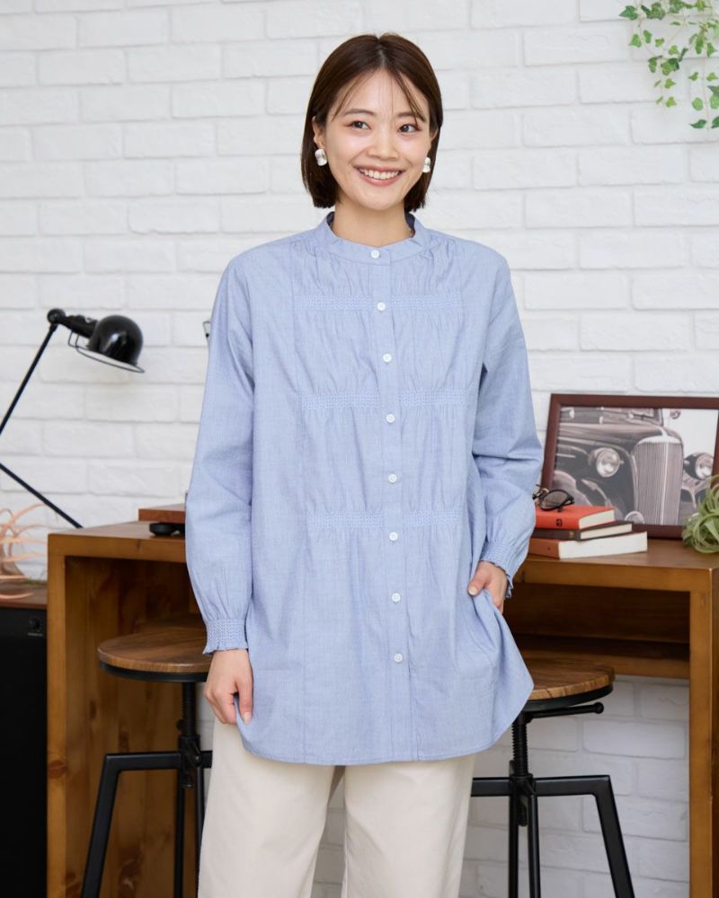 オーガニックコットン100%のシャツチュニックです。前身左右に3本づつと袖口にシャーリング刺繍を入れています。襟は低めのスタンドカラーです。一枚着でも羽織としても着用頂けます。色は2色展開で黒×白とネイビー×白のシャンブレーになります。 モデル身長: 167 cm 着用サイズ: M サイズ Golden Bear Ladies' ブラウス (Ladies') 同デザイン大きい(3L,4Lサイズ)はこちら 【着用アイテム】467RC001 バンダナ