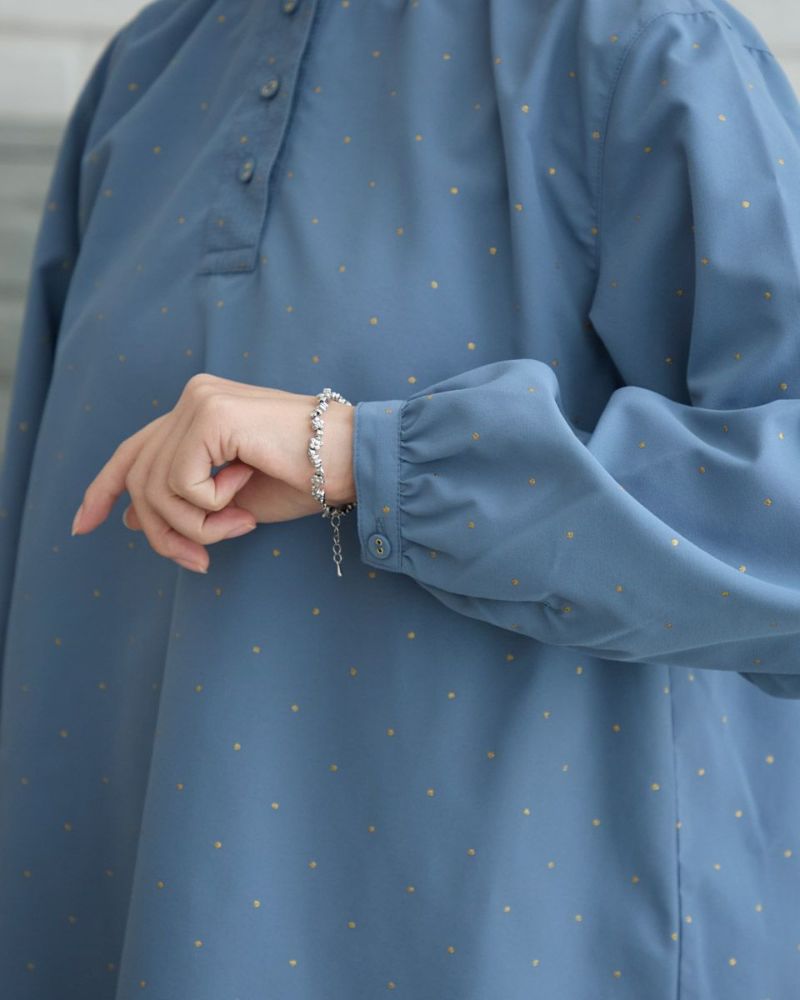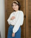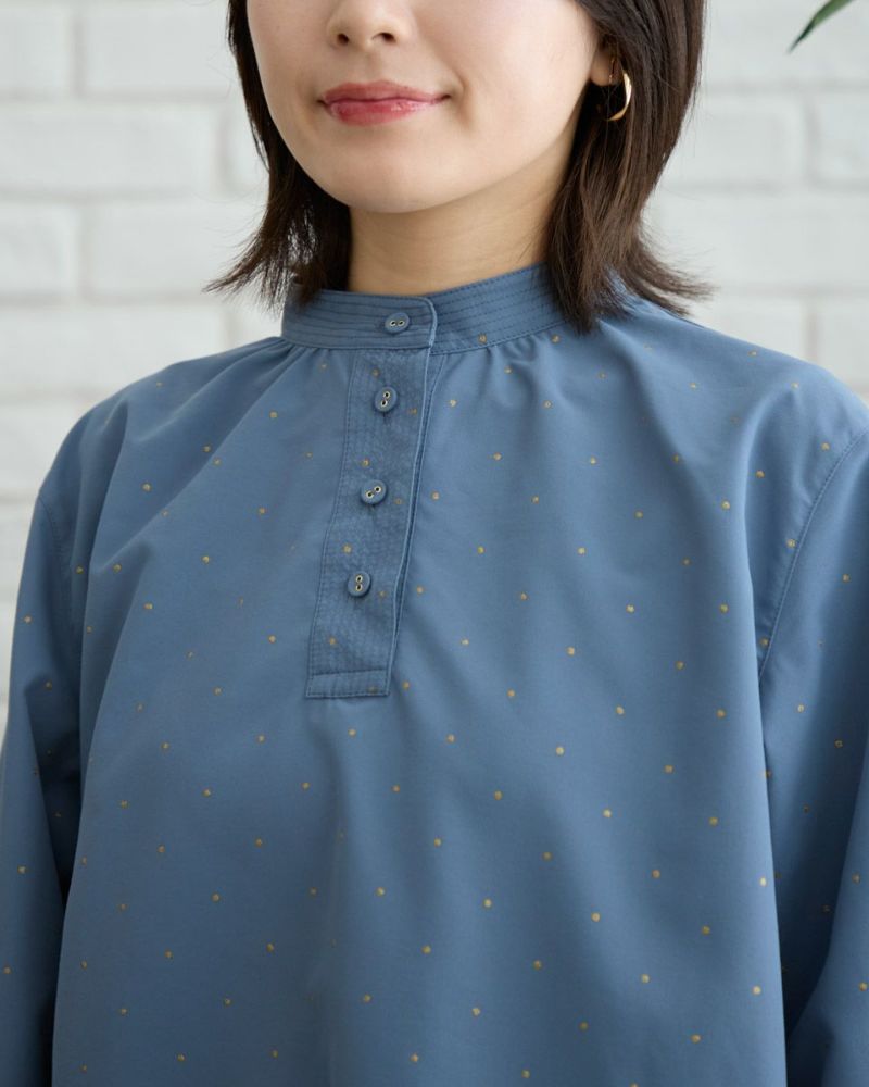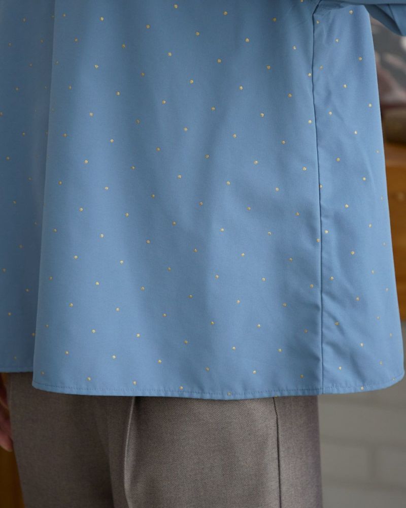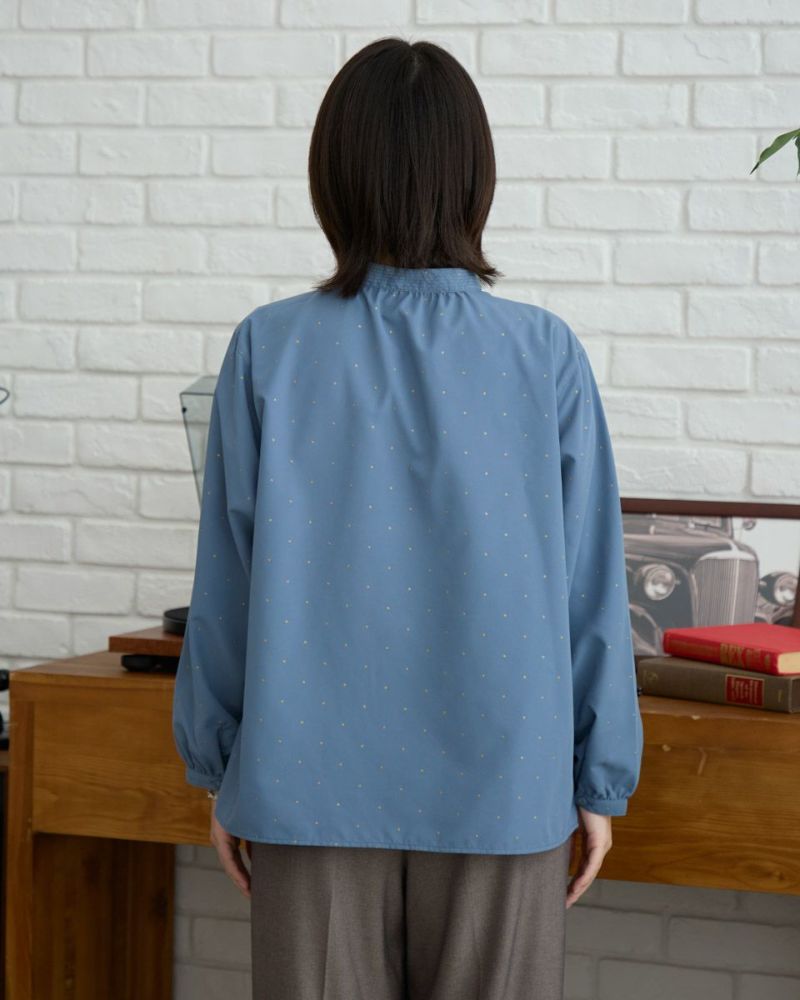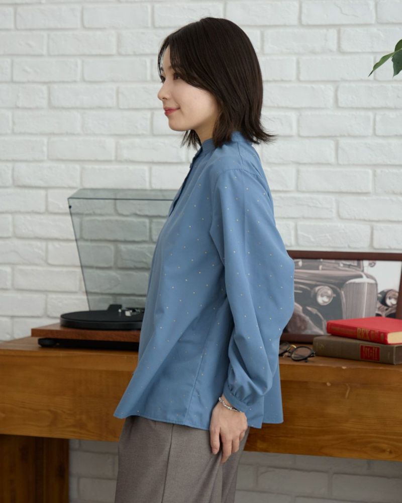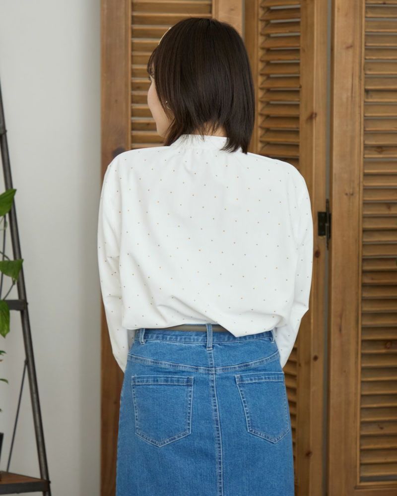 グリッターのラメドットがさりげなくも華やかな印象のブラウスです。ステッチを効かせた襟と前立てがデザインのポイントです。Aラインシルエットで女性らしさを演出します。 モデル身長: 162 cm 着用サイズ: M サイズ Golden Bear Ladies' ブラウス (Ladies') 【着用アイテム】467RC712 デニムAラインスカート