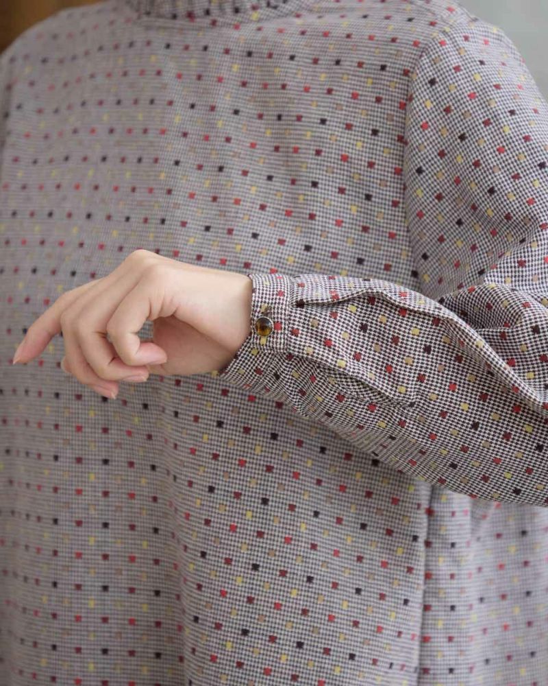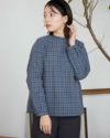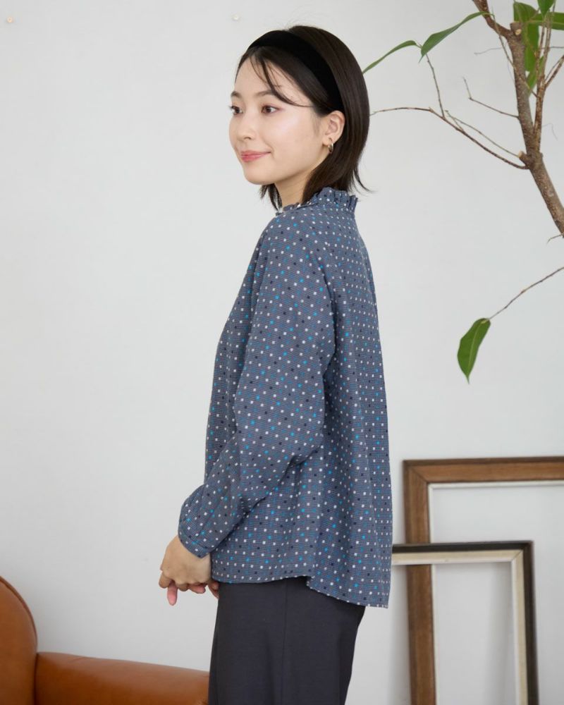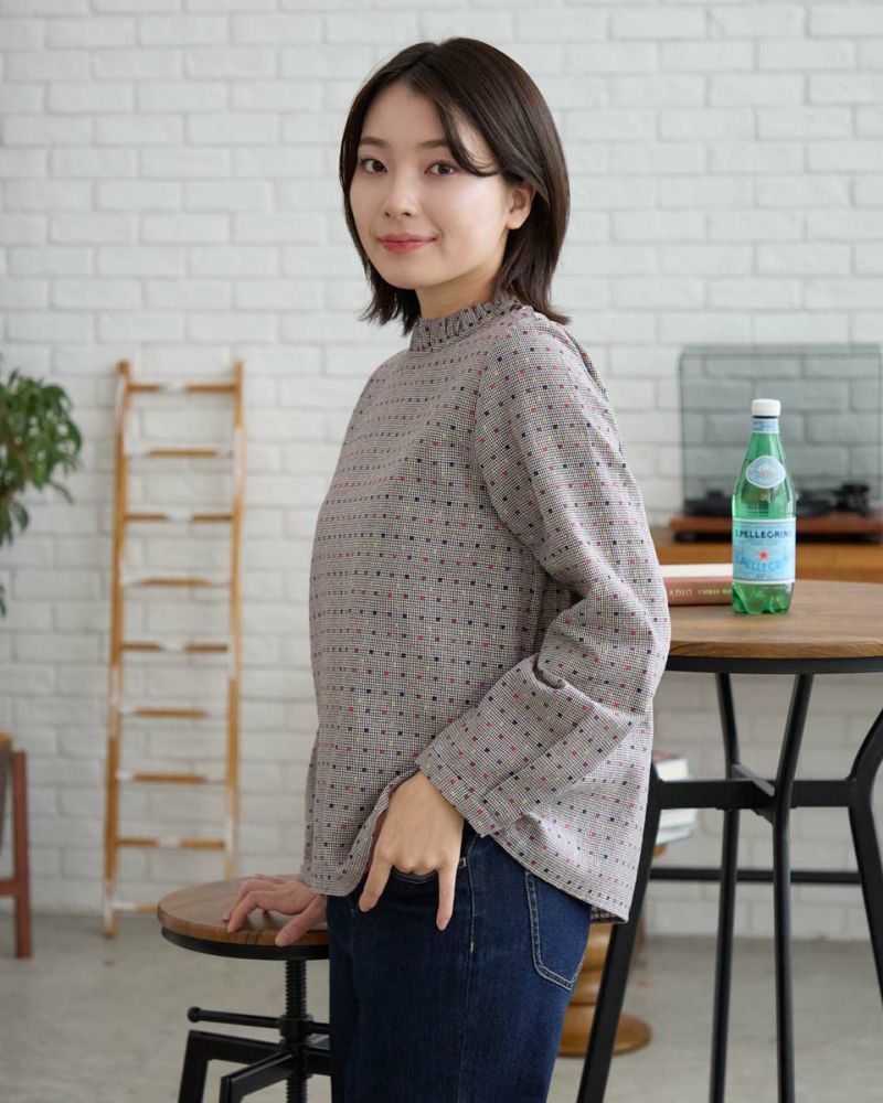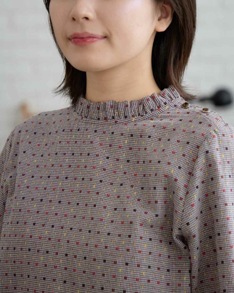クラシカルな印象を引き立てる千鳥格子柄に、フリルの襟元が映えるブラウス。被り仕様ですが襟元のボタンで着脱もスムーズ。甘すぎない柄とディテールで上品な一枚です。ジャケットやカーディガンのインナーとしても映える、着まわしのきくアイテムです。