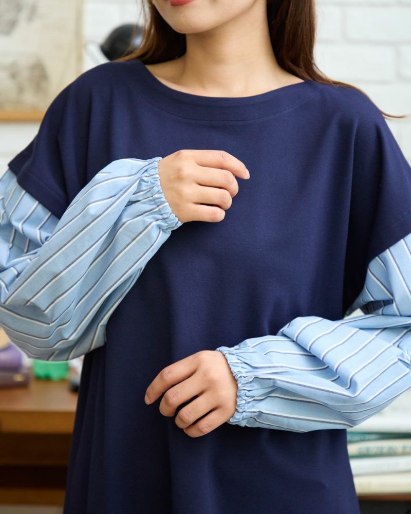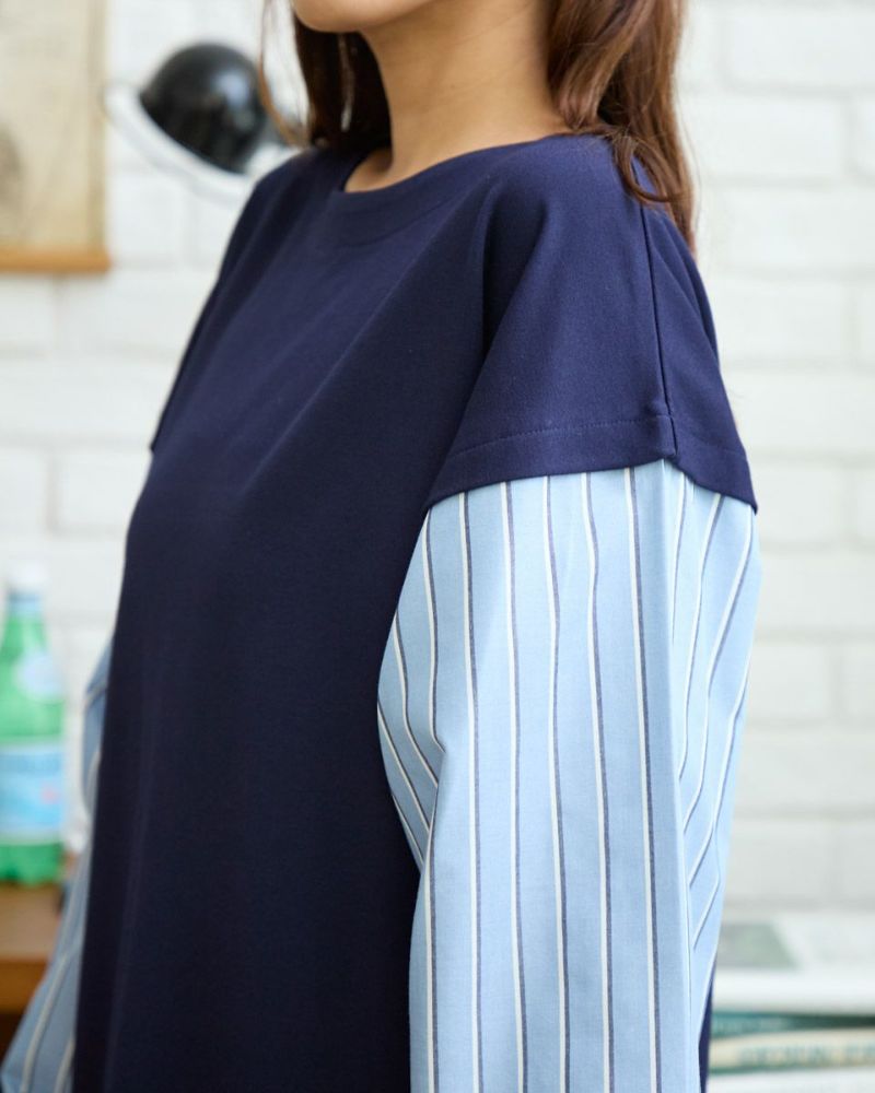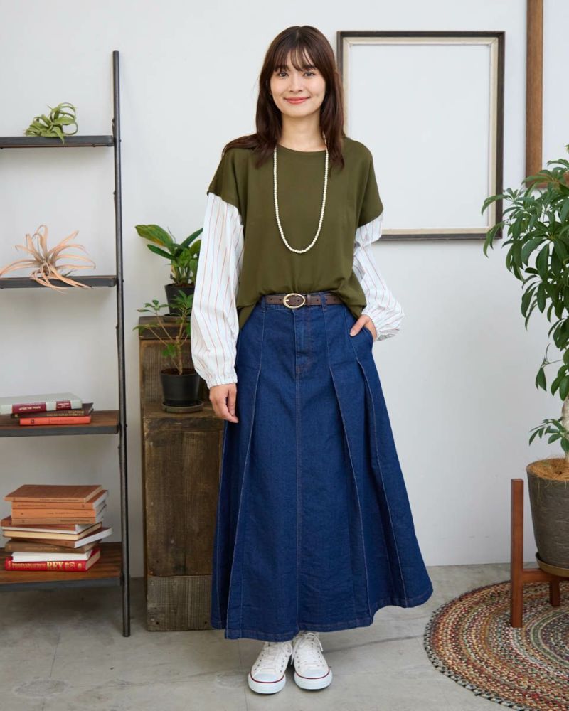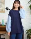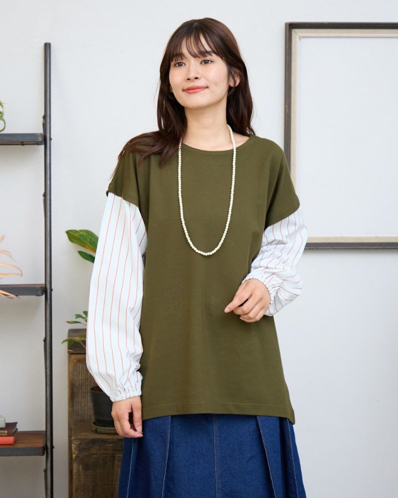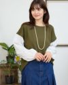 重ね着をしているようなデザインのトップスです。表面がきれいなポンチ素材とシャツ地のコンビで楽ちんなのにきちんと見えます。袖口はゴムでたくしあげやすい仕様にしています。 モデル身長: 168 cm 着用サイズ: M サイズ Golden Bear Ladies' カットソー (Ladies') 【着用アイテム】467RC702 ブーツカットパンツ 468RC751 デニムスカート