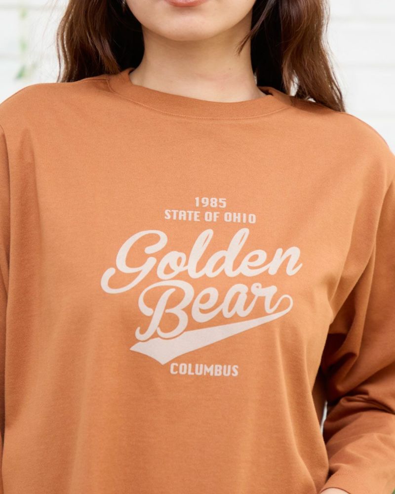 やわらかさが心地よい、オーガニックコットン100%の天竺Tシャツ。フロントには、GOLDEN BEARオリジナルのロゴデザインをフロッキープリントで表現。立体感のある質感がシンプルな中にさりげない個性を添えています。一枚着としてはもちろん、インナー使いでも映える、汎用性の高いアイテムです。