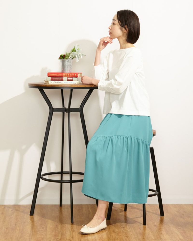 ほんのりと艶めくポリエステルの素材を使用。ほどよくハリも有り、身体のラインも拾いにくくなっています。肌の露出も少ないミモレ丈のギャザーフレア。左側の膝上だけを切り替えてギャザーをプラス、歩くたび左右で異なる動きが軽やかで華やかなスカート。鮮やかなグリーンカラーはトップスをオフやネイビーなどベーシックカラーにするとスカートだけが浮いて見えずトライしやすいです。ジオメトリックのプリントは春風をキャッチする意味も込めて風車をアレンジ。WHITEの文字も隠れている楽しい1着。パーカーやTシャツでカジュアルダウンする着方も可愛いです。