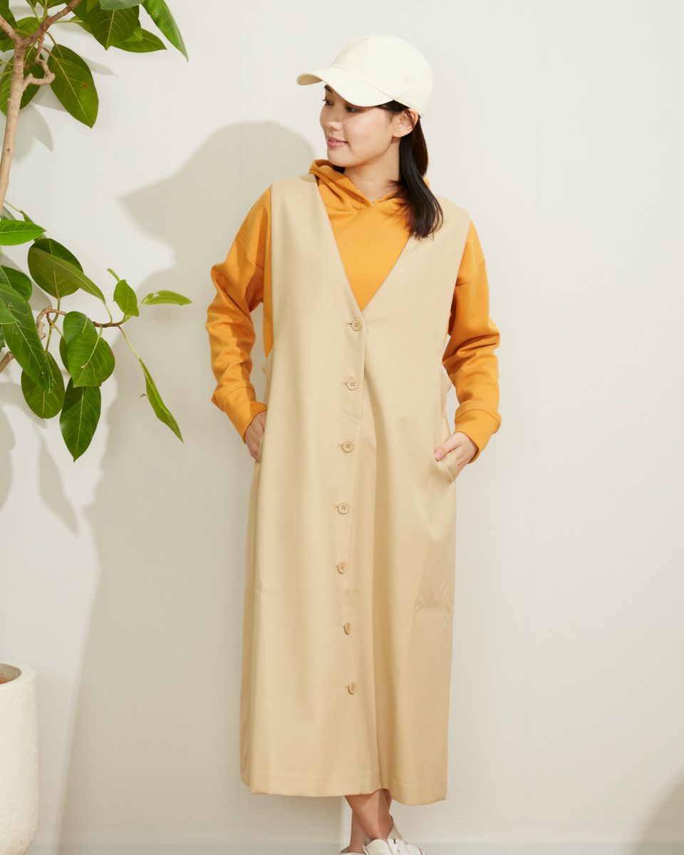 細かいツイル目の生地は、ほどよく厚みもあり、きちんと感と上品さが魅力です。深くV字に開けたネックラインとフロントのボタンが印象的な大人仕様のジャンパースカートになっています。アームホールも大きめに設定しているため、インナーとの着合わせもスムーズ。タートルカットソーの他、パーカーを重ねたミックスコーデも可愛くておすすめです。フロントのボタンはバスト下の2つまでしか開かない仕様になっているのでボタンの隙間から足が覗く心配がなく、自転車などでの送迎時も安心。広がりすぎないボディでシャープさも感じられるためオフィスに限らずデイリーにお召しいただける1着です。