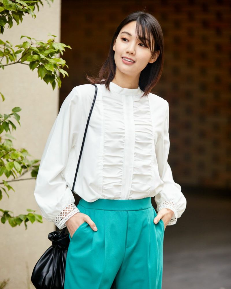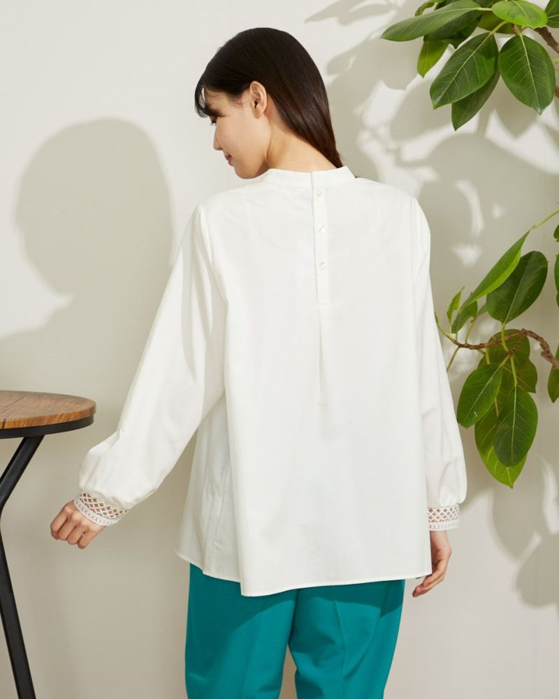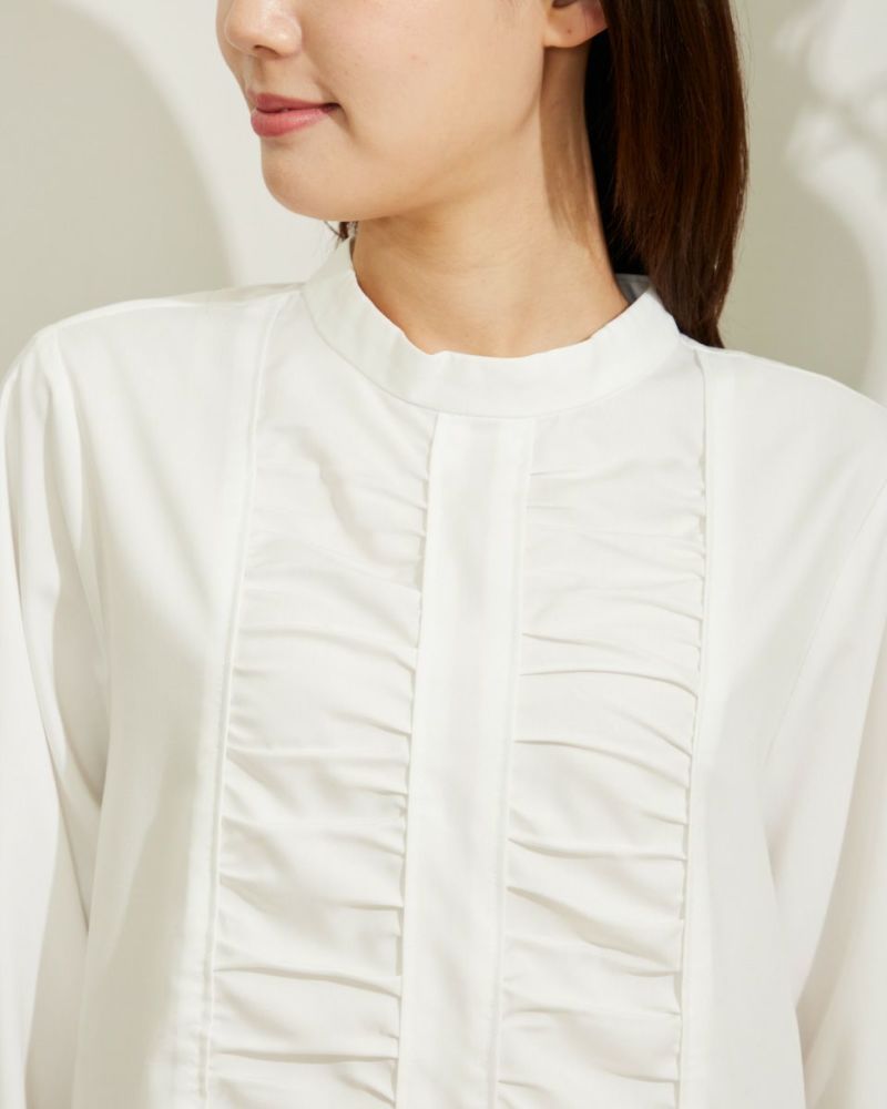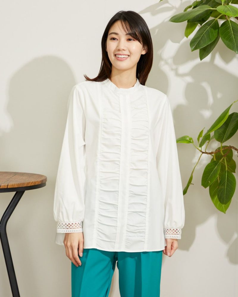 清潔感のある細かいツイル目はほのかに光沢も有り、しなやか。前身頃にキャザーをタテ方向に寄せたディティールが華やかでオフィスや習い事にお薦めのブラウス。5cmほどのレースを付けた袖口もフェミニンなポイントになっています。他のアイテムと合わせやすいカラー展開で、ジャンパースカートやジレとのコーディネートも素敵です。ブラウス自体に華やかさがあるためアクセサリー要らずでコーディネートも決まるため忙しい朝の身支度にも便利です。