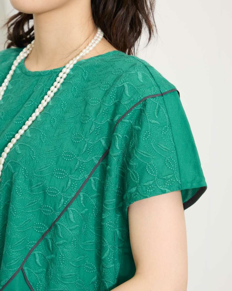 生地表面の細やかな凹凸がナチュラルで優しいコットンの生地です。伸びやかなツルが印象的な草花を表現した刺しゅうを施し、無地とブロッキングしたデザインブラウスです。暑い日差しに負けない黒と強いグリーンのボディは、晩夏まで使えメタルやビーズのアクセサリーと好相性。ボトムスを変化させオン・オフでお召しいただけます。 モデル身長: 166 cm 着用サイズ: M サイズ Golden Bear White Label (Ladies') ブラウス (Ladies') 【着用アイテム】468QA751 イージーパンツ 468QB751 ベイカー風イージーパンツ