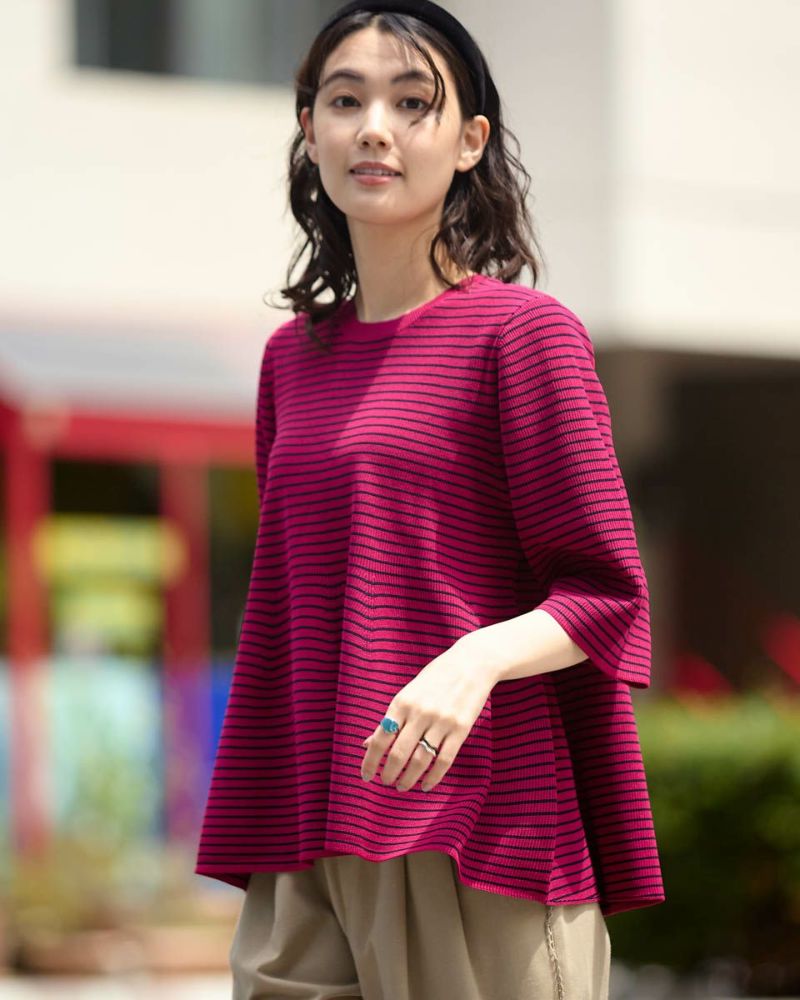 2ミリほどのタテ畝が隙間なく並ぶ片畔の編地は身体のシルエットを拾い過ぎず、適度な厚みが初秋までのスイッチシーズンに便利です。バスト下から揺れるフレアは編地の弾力でダレず上品な雰囲気。パンツを合わせた方がバランスが取りやすくジュエリーを添えてオフィスや食事会でお召しになってもOKです。 モデル身長: 166 cm 着用サイズ: M サイズ Golden Bear White Label (WOMEN) ニット (WOMEN) 【着用アイテム】467QB701 デニムワイドパンツ 468QA751 イージーパンツ