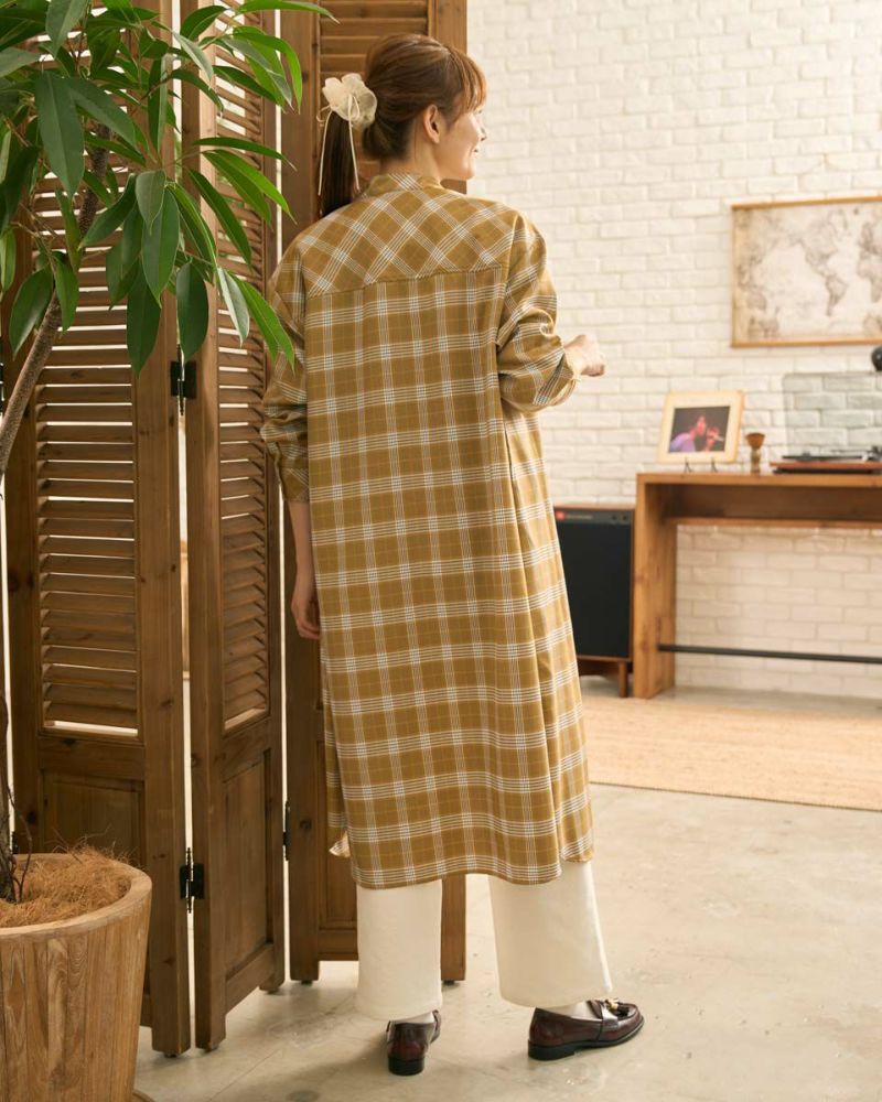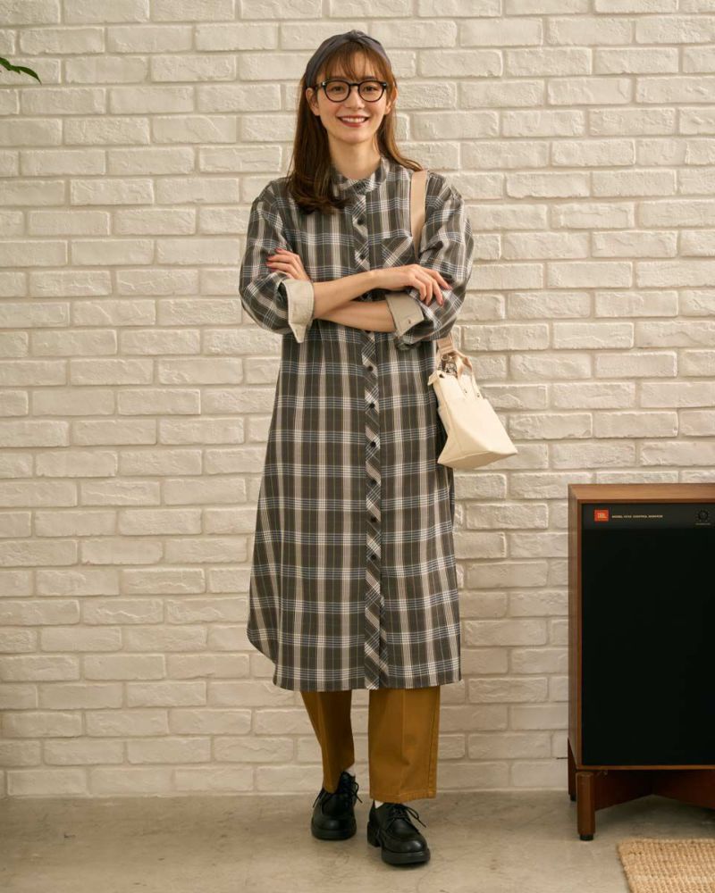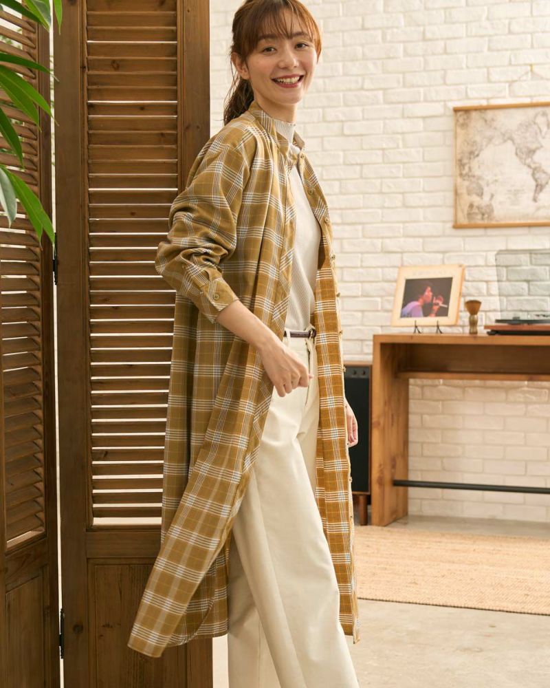 ツイル目の柔らかい先染めチェックの生地を使ったシャツワンピース。生地表面には、ほのかな光沢が有り砕け過ぎず大人世代におすすめです。バンドカラーに設定した襟は顔周りをスッキリと映しタートルカットソーとのレイアードも簡単に決まります。裏面に薄く起毛をかいている点も嬉しいポイント。肌触りがソフトで冷たく感じにくくなっています。フロントの釦を全て開けてガウンのように纏ったりデニムなどのボトムスを合わせてもこなれた雰囲気が出て素敵です。ネックレスやロングブーツで光をプラスした着こなしもおすすめ。