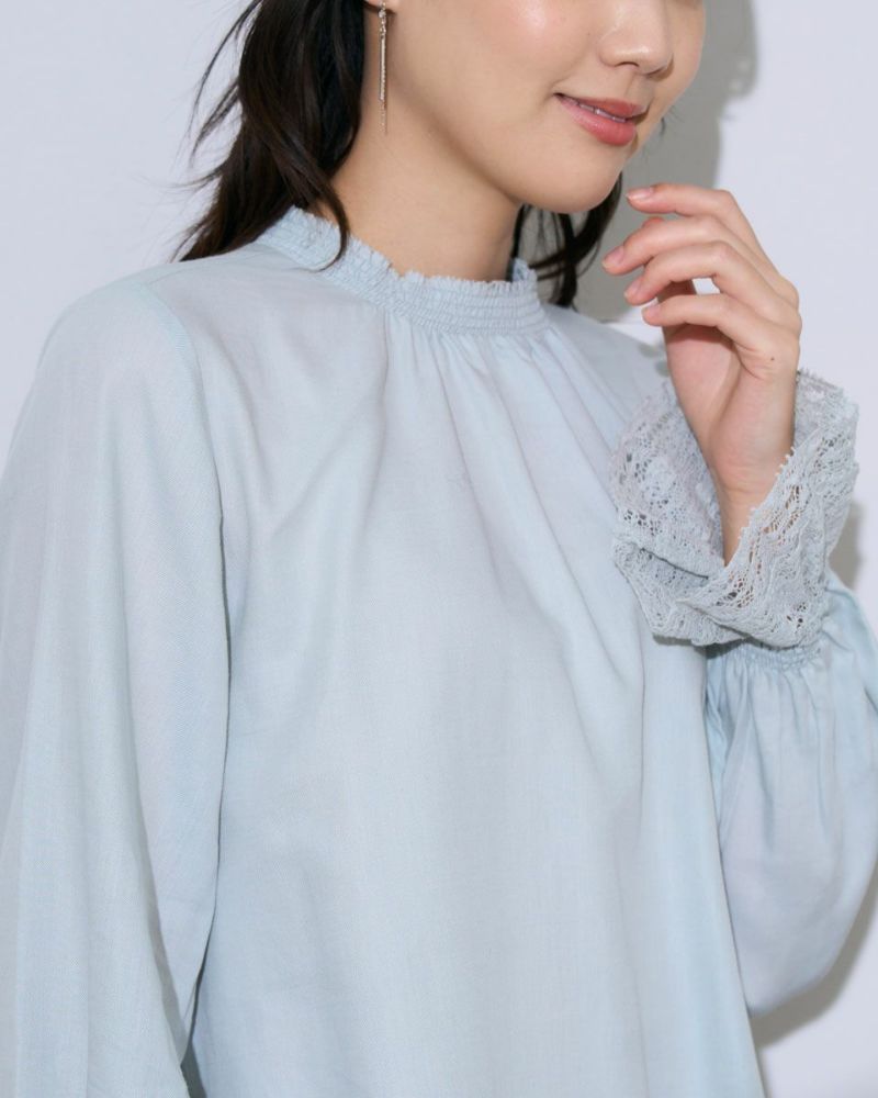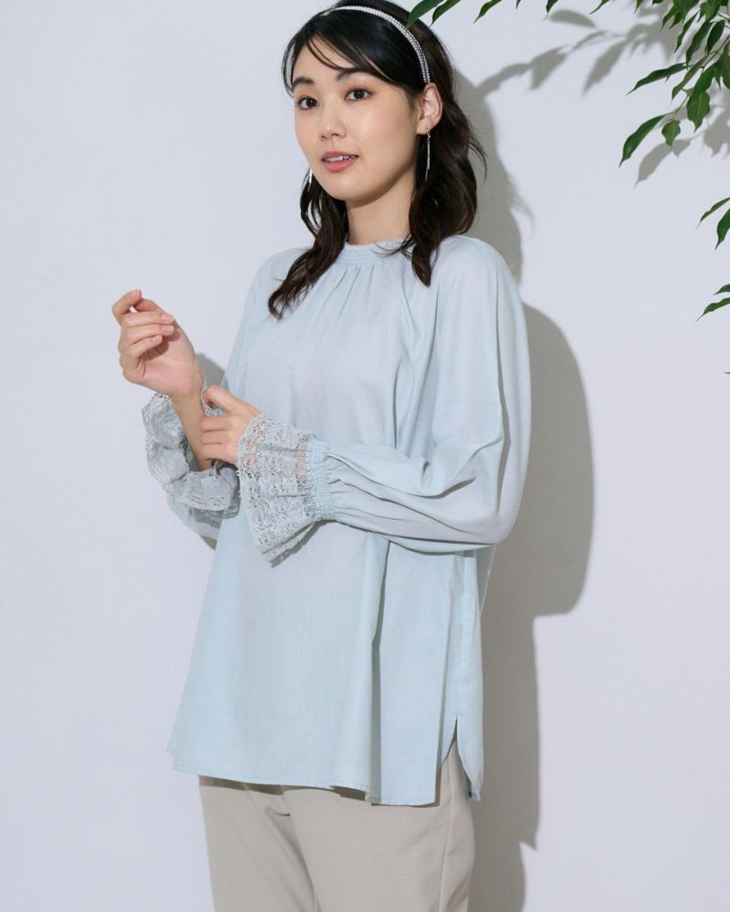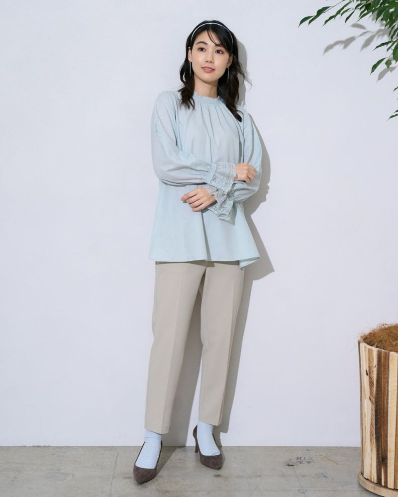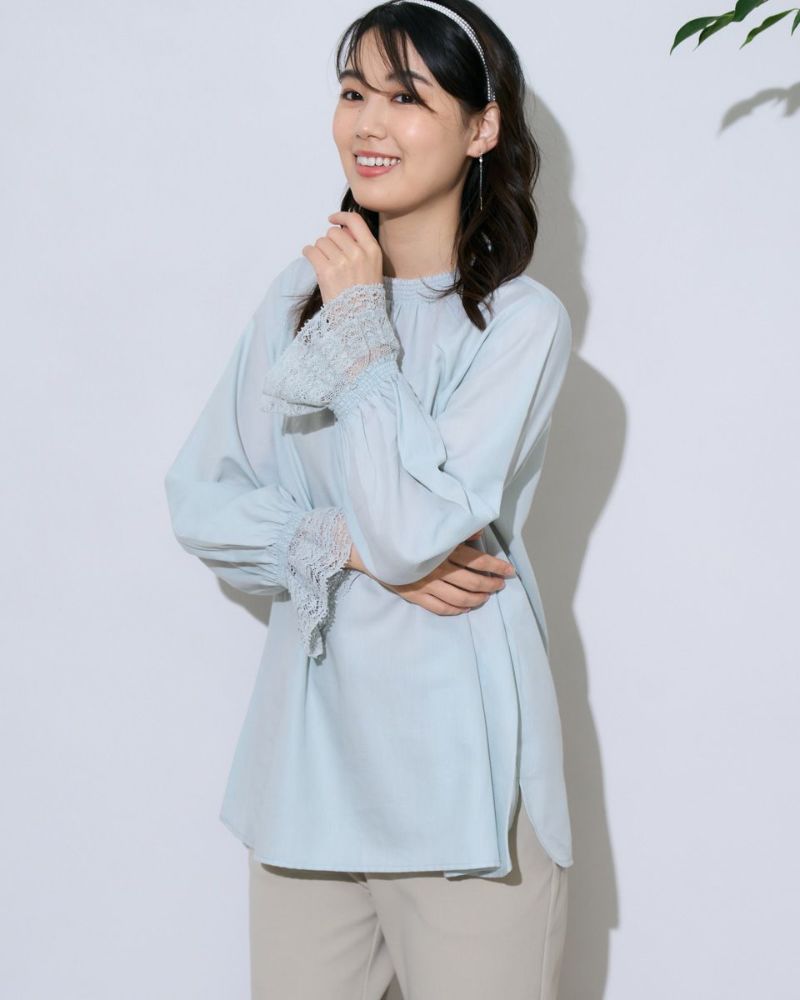 細かくツイルに織られた生地は、ほのかに光沢もありナチュラルすぎないところが魅力。滑らかですが身体のラインを拾いすぎないソフトタッチな被りのブラウス。少し立ち上げた襟と袖口に施したシャーリングで生地に立体感が足され華やかさも一緒に纏えるアイテム。ジャケットやカーディガンとの相性も良く、オフィス使いにおすすめ。優しい春カラーでパールを添えて謝恩会など親しい方とのパーティでお召しになっても素敵です。 モデル身長: 166 cm 着用サイズ: M サイズ Golden Bear White Label (Ladies') ブラウス (Ladies') 【着用アイテム】468R1150 ショートトレンチコート 468R1750 ストレートパンツ 468R2750 テーパードパンツ