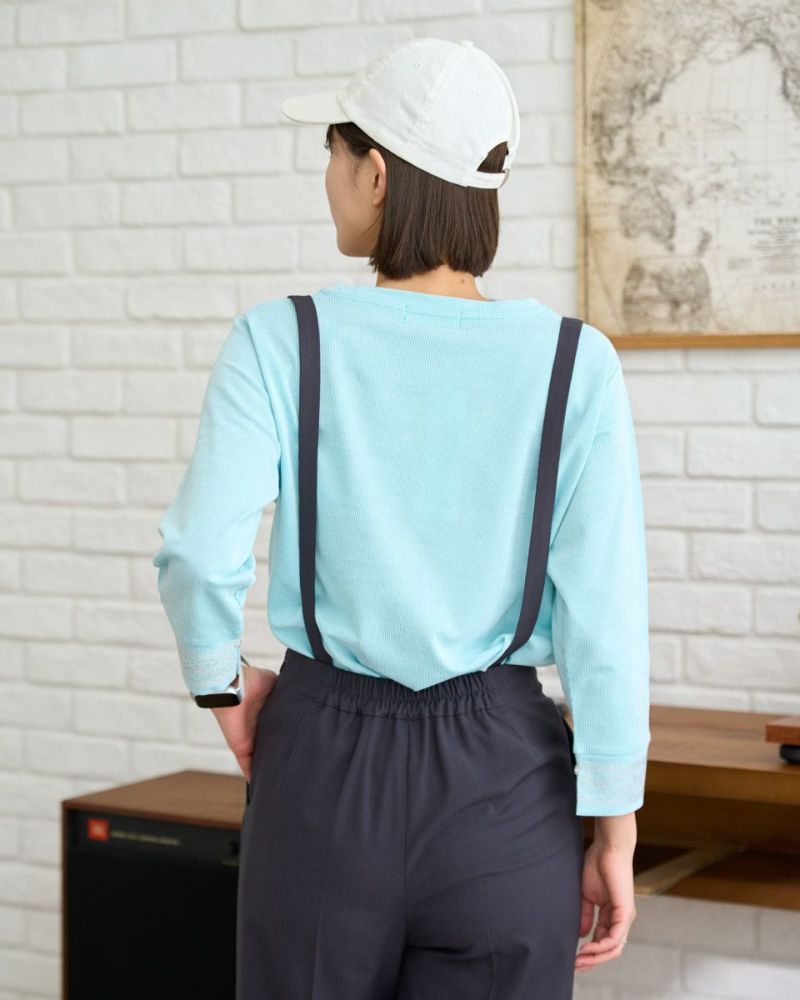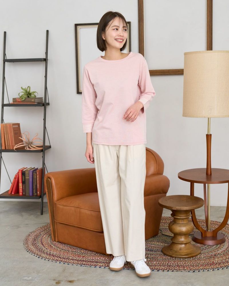 ヨコ方向のテンションに優れた生地は着心地が良く、春夏のラインナップでもお馴染みの素材。細かくストライプに編んでいるため無地見えし他のアイテムとも相性抜群です。重ね着にも便利なセットインスリーブ仕立て。アンティークのレースをイメージした刺しゅうで飾った袖口が可愛らしく初夏まで1枚着をお楽しみいただけます。甘さを抑えたピンクカラーは顔映りを明るくし大人世代におすすめの春カラーです。 モデル身長: 167 cm 着用サイズ: M サイズ Golden Bear White Label (Ladies') カットソー (Ladies') 【着用アイテム】468R2750 テーパードパンツ 468R3760 ストレートパンツ