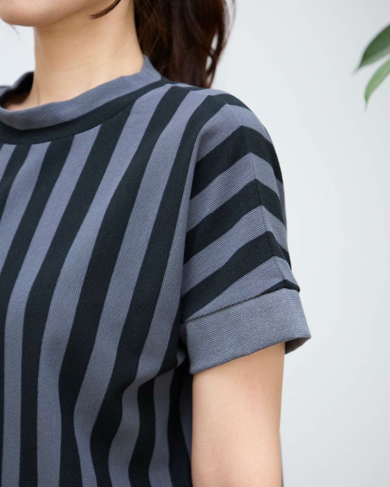 少し立っているネックも、 ストライプのデザインもオシャレな1枚ですねー。 ちょっと粗めの編地も涼しげです。