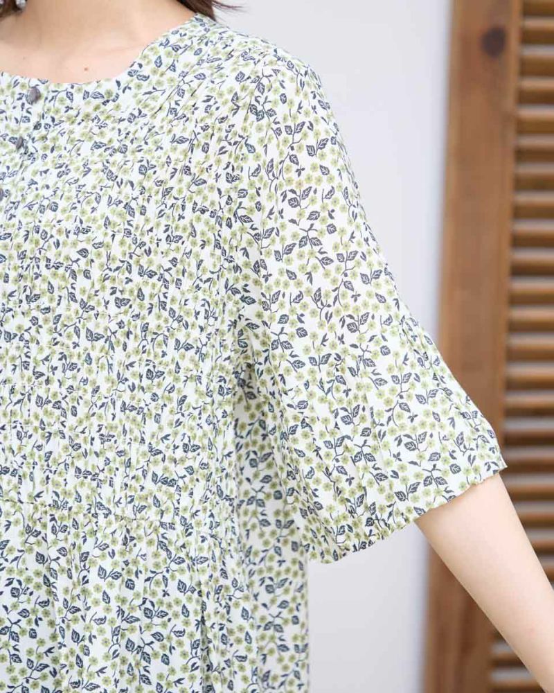 麻のナチュラルさと滑らかなレーヨンをブレンドした素材を使用。バストに入れた沢山のギャザーやバルーンの袖口も立体感はキープしレーヨンの効果でほどよく落ち身体のボリュームを拾わない点が魅力です。腹部を覆う着丈でパンツ合わせがお薦め。甘い香りを放つ一日花のハマナスが柄のイメージ。刹那的で美しい悲しみの花言葉が大人っぽくスクエアネックにスキンジュエリーを添えた着こなしも素敵です。