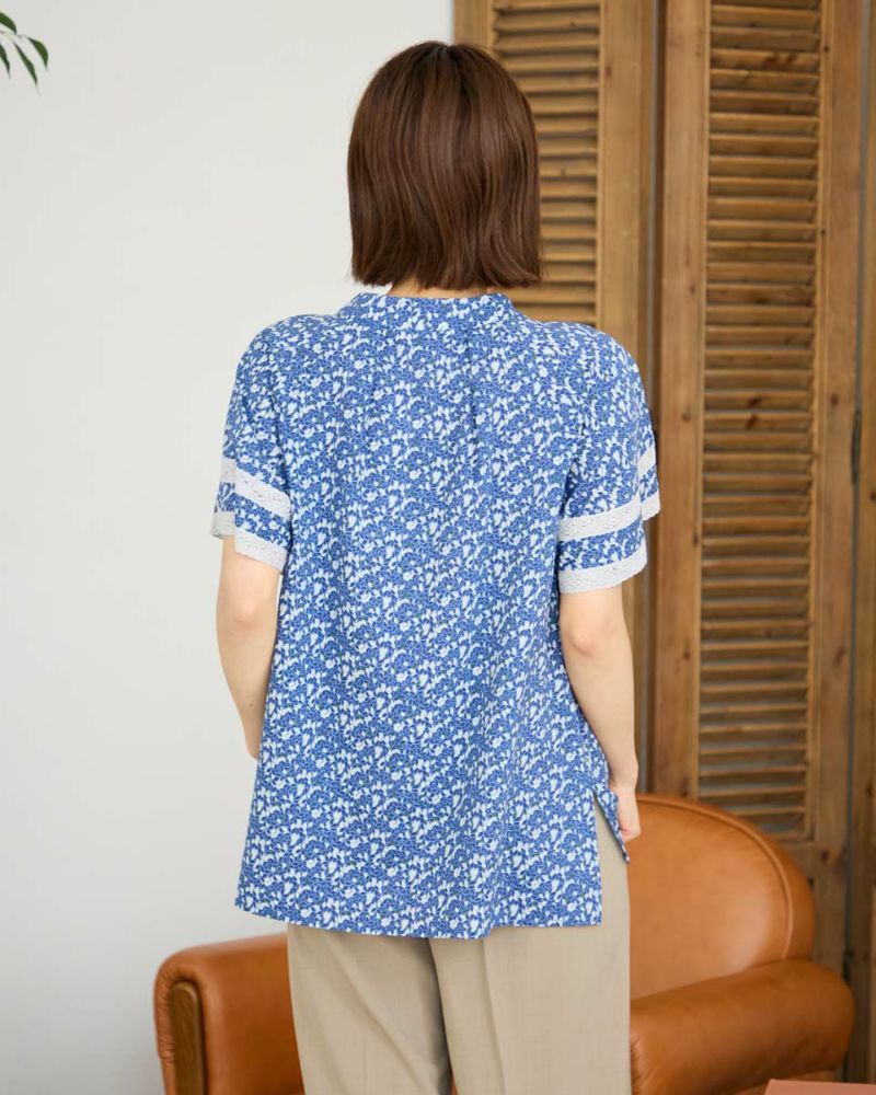 秋の収穫に向けて小さな実を付け始めたオリーブをイメージしたプリントブラウス。肩を優しく包むラグランスリーブは袖口のフレアが揺れ優雅で涼しげ。袖下の内側にマチを付けているため脇や下着が見えにくく1枚着もしっかり担います。素材がしなやかに落ちるため上品な佇まいが魅力です。蒼く茂る葉を落ち着いたトーンで表現し、全体的にシックなため初秋まで着用が可能。綺麗めなボトムスと合わせてオフィスや学校行事でお召しになっても素敵です。デニムやカゴバックとのカジュアルコーデも◎パールやスキンジュエリーで光を添えたコーデも梅雨どきの曇天に映えおすすめです。