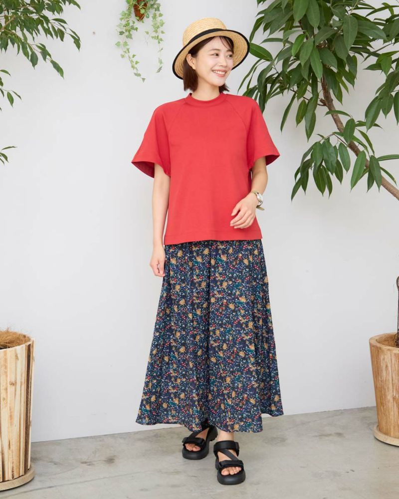 生地の表裏ともに整った編地でキレイ見えするスムースをセレクト。春夏の定番、天竺と比べ密な編地でヨコ方向のテンションに富み、ダレにくい点が魅力です。ハイネックが印象的なデザイントップスは暑い時期に首元を覆うためモードで洒落感が強く、いつものボトムスの鮮度が上がるキラーアイテムです。気温が変化するスイッチシーズンにも使えるためトップスを新調されるお客様におすすめ。カーブを抑えたラグラン線や広がりを足した袖口で体操服感が消され大人が楽しめる1着に。赤いボディはワンウォッシュのデニムと相性が良く程よい肌見せでパリシックにお召しになっても可愛いです