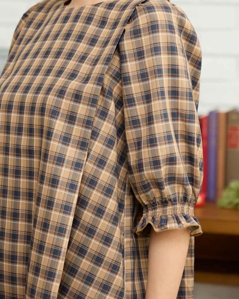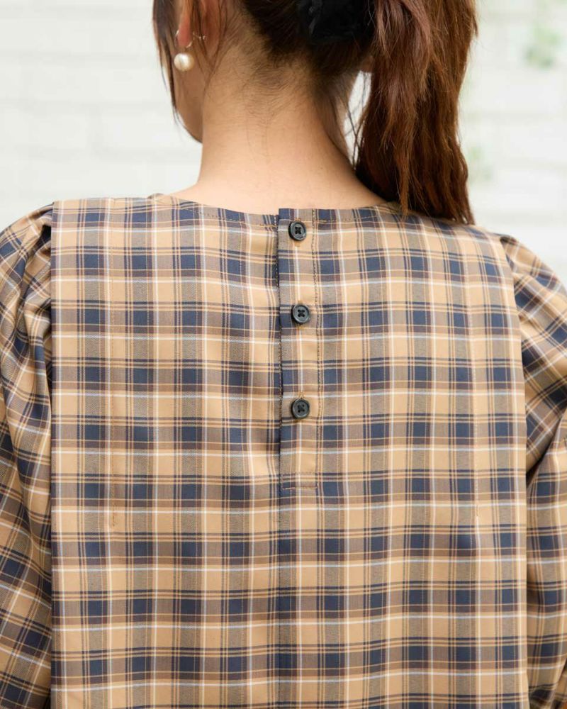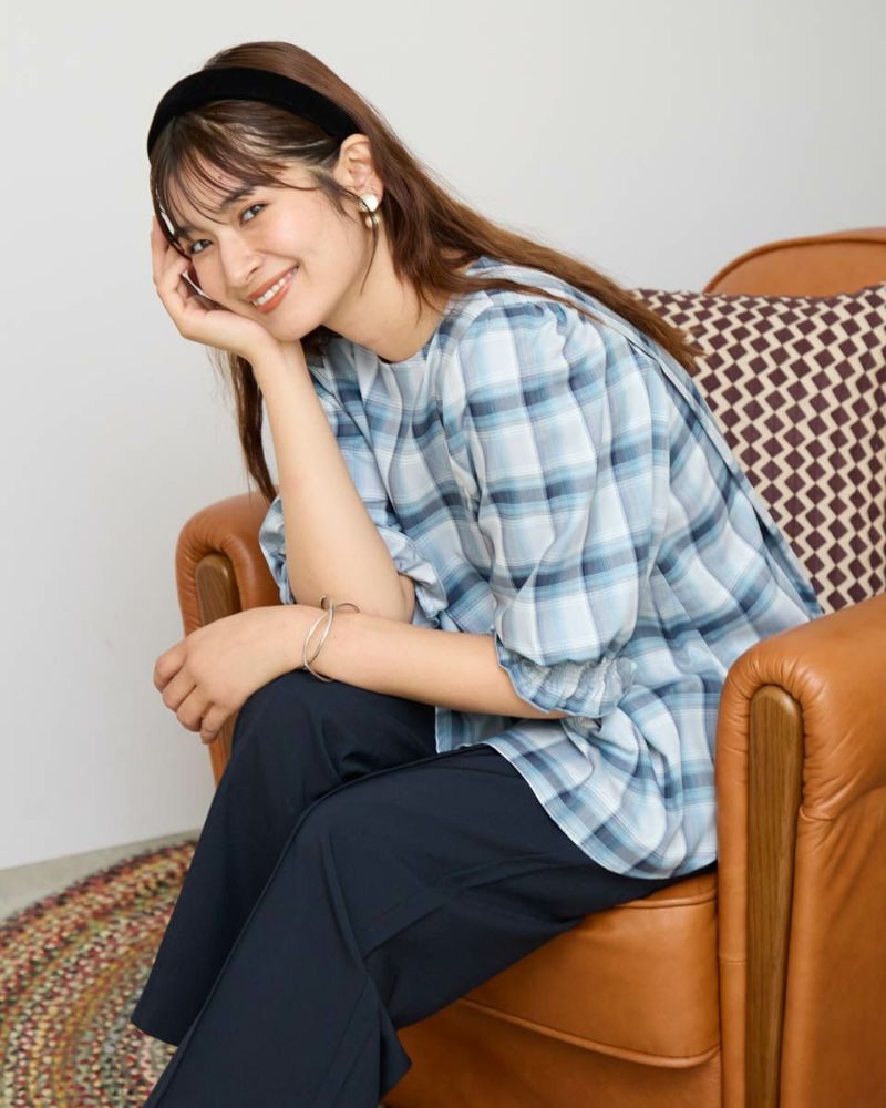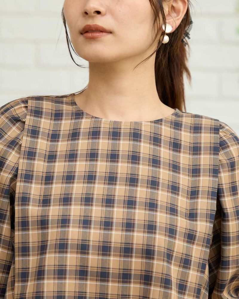 カジュアルな印象のチェック柄をポリエステル・レーヨンを使って表現しました。コットン単体に比べ強張りが少なく、しなやかに身体を包む様子も魅力。ほのかにツヤ感がありタックで揺れる裾や膨らみを付けた袖も幼さが消え着用しやすいです。パンツとバランスが取りやすくスラックスと合わせたオフィススタイルも素敵です。カーブパンツやデニムとのカジュアルコーディネートではジュエリーやキャップで辛口に仕上げると甘さのあるディティールが活きるのでおすすめ。キャメルベースのタータン調チェックと、グレ-をベースに滲んだような柔らかい雰囲気が特徴のオンブレチェックの展開で色みが深まる初秋にも着用が可能です。