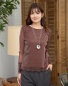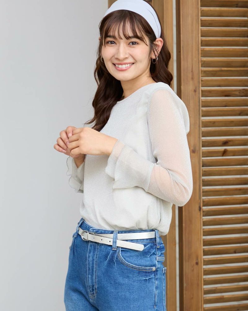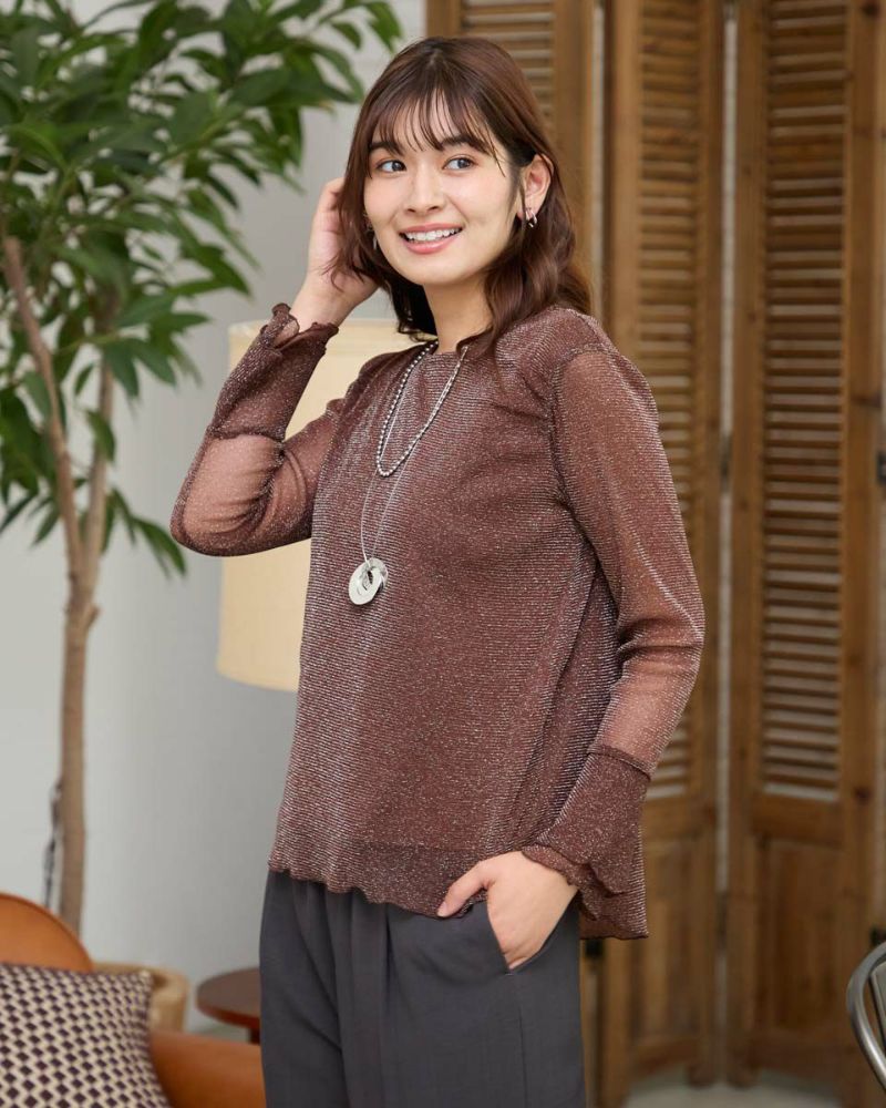ドレスでお馴染みのチュールネットを使ったデザインカットソーです。小さな六角形の編み目が連続し編まれた素材はヨコ方向のテンションに優れソフトに身体を包みます。前後の身頃は天竺と2枚仕立てにして透けを遮断、インナーの透けを心配することなくお召しいただけます。袖はチュールの1枚仕立てですが一緒に編み込まれたシルバー糸の煌めきで肌の透け感、存在感が軽減されシアーアイテム初挑戦のお客様にもトライしやすい1着です。袖口のフレアが揺れ手先を綺麗に映します。ニュアンスのあるライトグレーはパーティー感がなく合わせやすい点もポイント。ジレを羽織ったり冬はスウェットを重ねても素敵です。