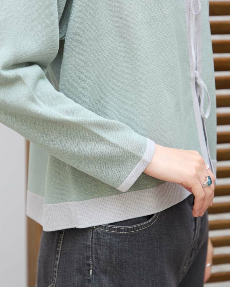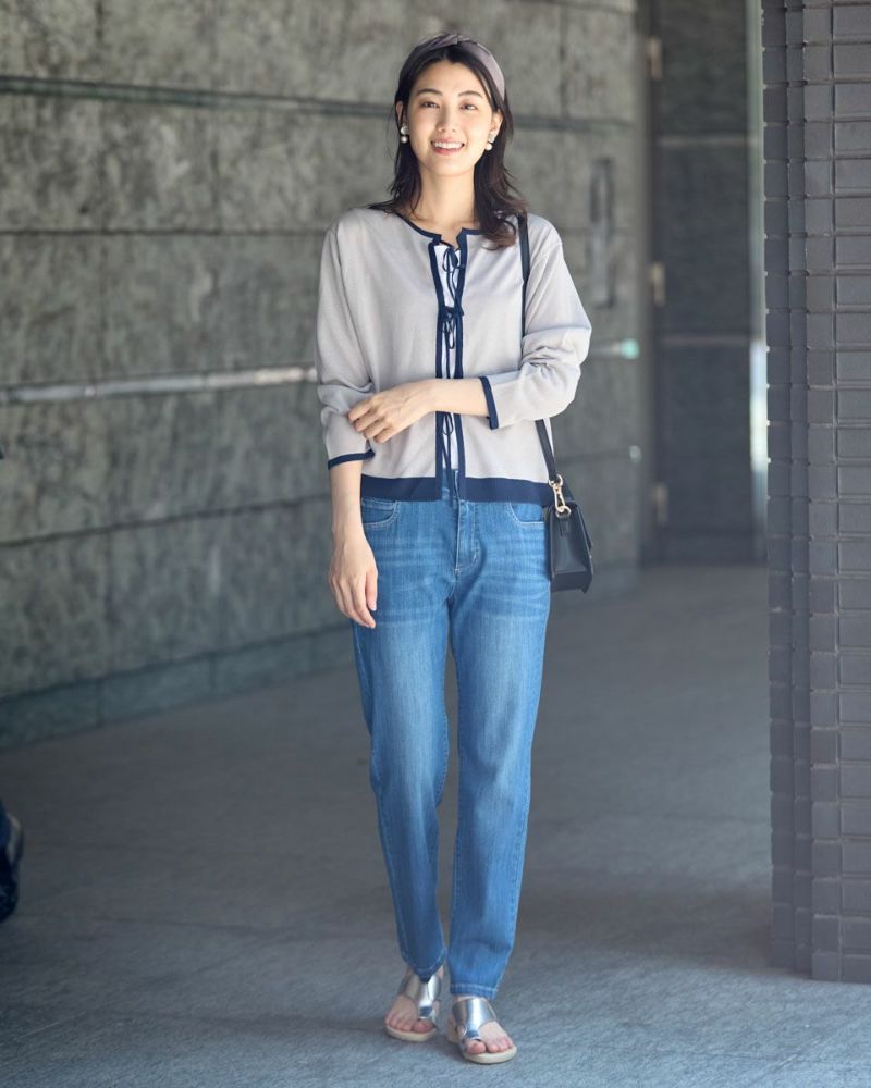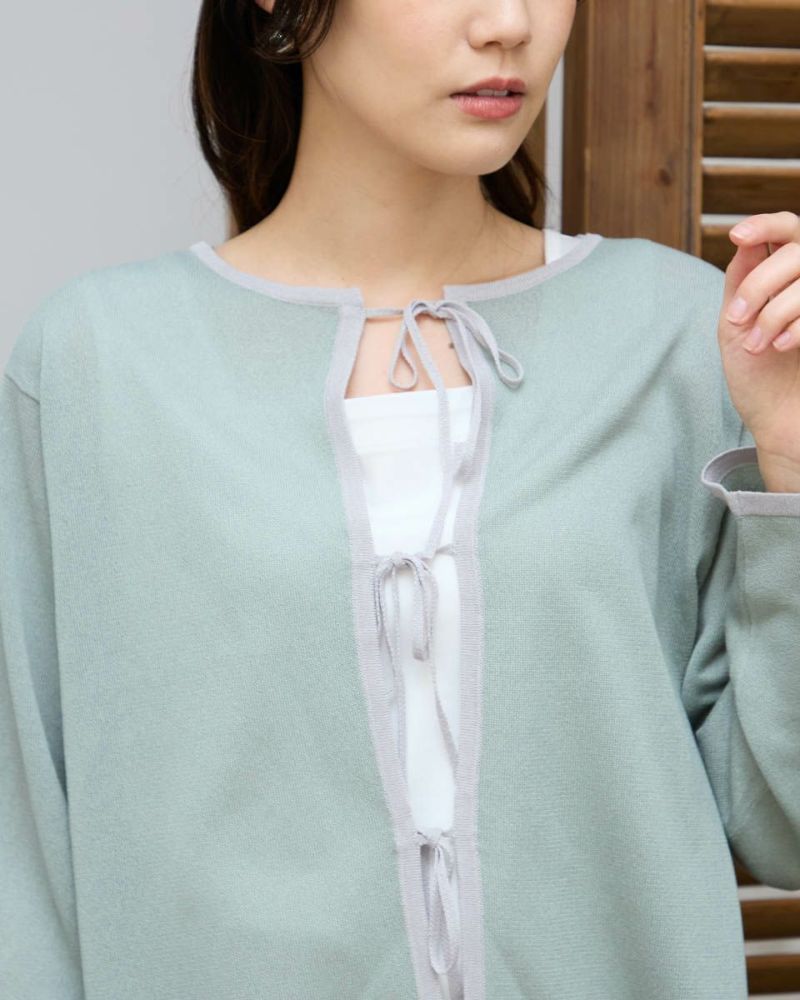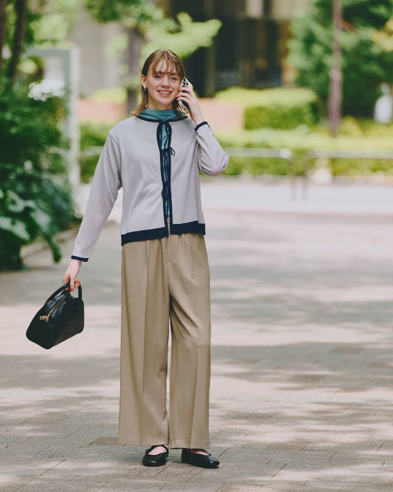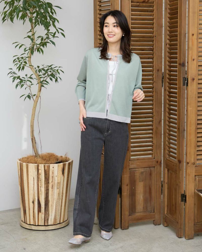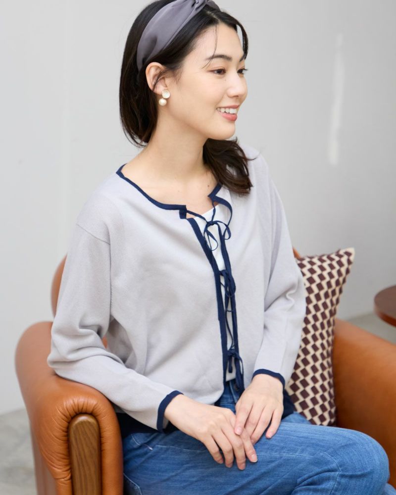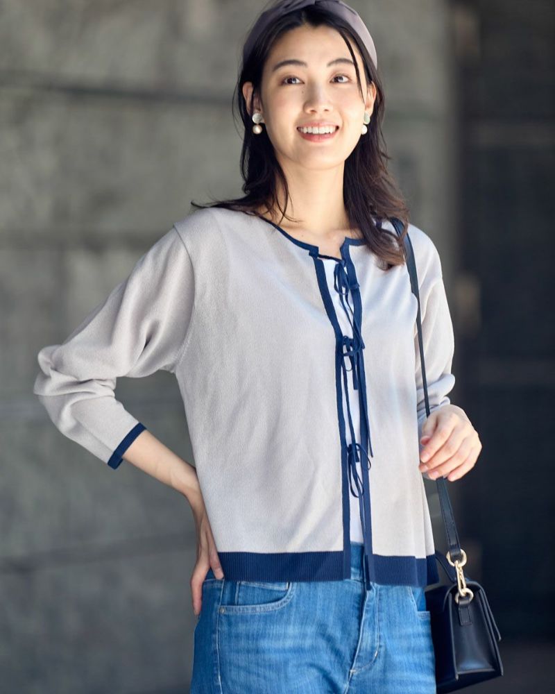ほどよいシャリみとツヤ感があるハイゲージの編地はキレイめな表情が魅力。長袖に設定したカーディガンですが毛羽感も無いため熱がこもらずサラッと肌当たりも涼やか。配色のトリミングとフロントのリボン使いがアイキャッチになる1着。セットインスリーブできちんとした印象もあるためオフィスや学校行事での着用もおすすめ。フロントのリボンは結んでポイントにしたり垂らしたままラフさを演出してもOK。フェミニンなアイテムなのでデニムと合わせたミックスコーディネートやカーディガンを主役にワンピースに羽織るスタイルも素敵です。ニュアンスのある落ち着いた配色は秋カラーとも馴染み10月頃までお召しいただけます。