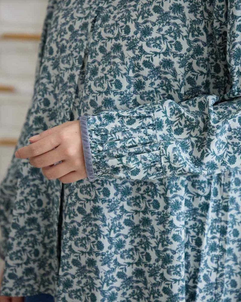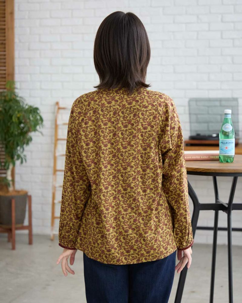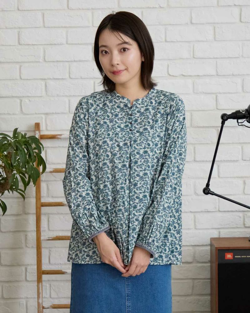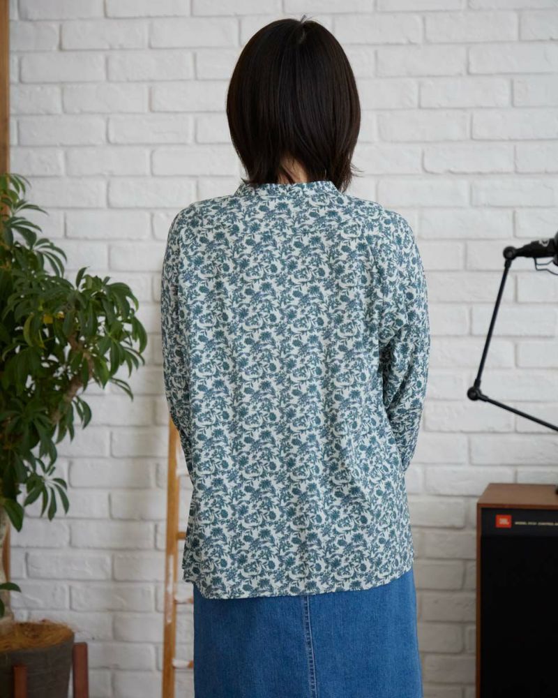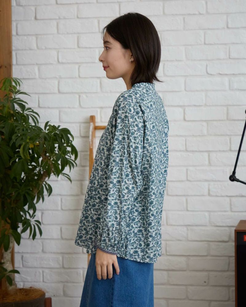 平織りの綿レーヨンを使ったブラウス。強張らず、しなやかに落ちるため上品な佇まいが魅力。フロントのヨークがポイントになりジャケットやジレを羽織るスタイルも素敵です。腰骨ほどの着丈はボトムスを選ばずデイリーに着用が可能。袖口にあしらったベロアがクラシカルに手元を映します。色の強さや儚さを重ねて表現したサンザシの柄をプリントしています。シックな中にも甘さがある大人のブラウス。海風が冷たい静かな青島の街。真っ赤な実が有名と、両手いっぱいにサンザシのお菓子を持たせてくれ、中国出張で触れ合った人たちとの思い出を込めたプリントです。