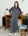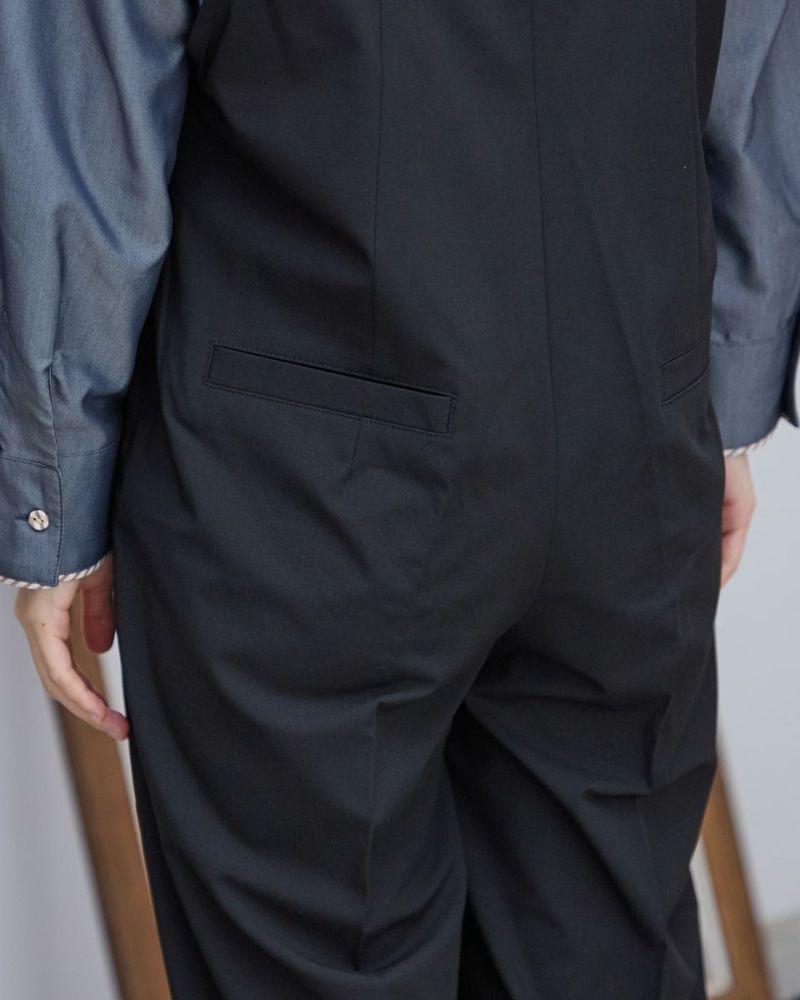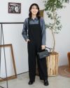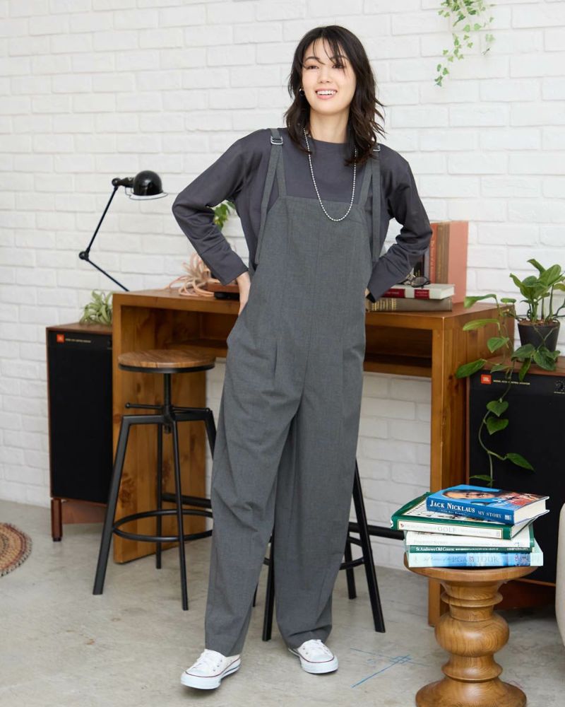 ほのかな光沢と整った織り目が上品な生地で仕上げたサロペット。トップの身頃幅をコンパクトにし、バストや背中が広く見えない工夫をしています。光を抑えたショルダーのメタルアジャスターには落ち着きがあり大人世代におすすめの1着。パンツ部分はほどよく揺れるストレートシルエットで、足のラインを拾わずスラックスのようなきちんと感があるため、オフィスや推し活での着用も素敵です。ブラウスやタートルカットソーなどインナーを選ばない優秀アイテム。ハンサムな雰囲気があるので一粒パールのピアスや指先のネイルで艶を足す着こなしもおすすめです。