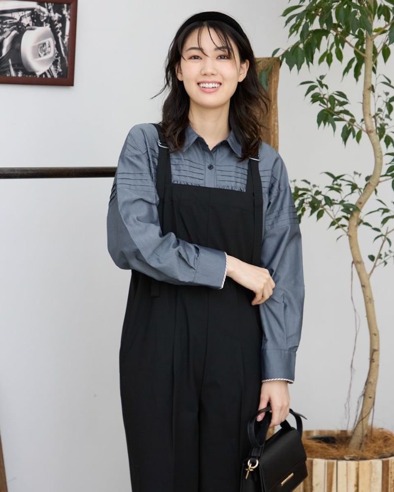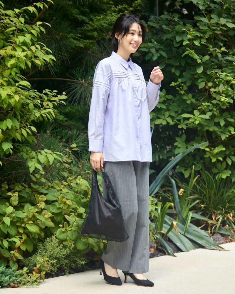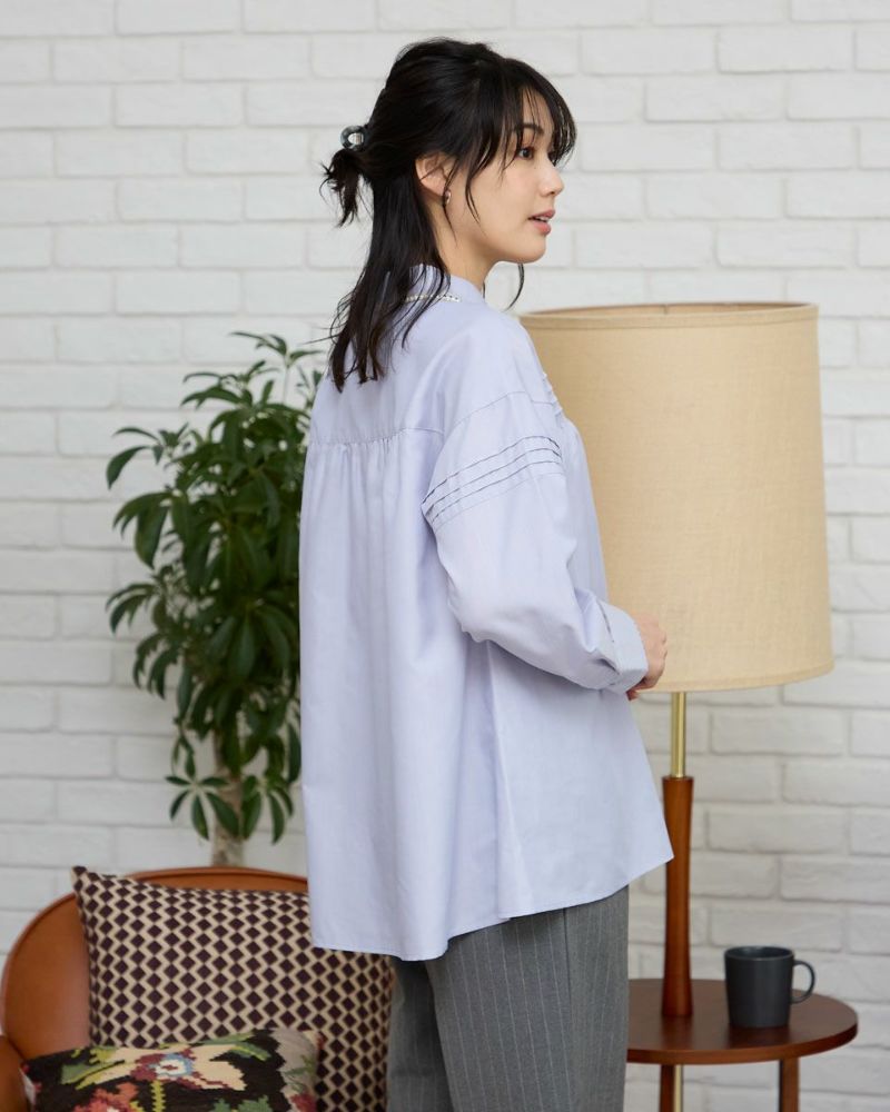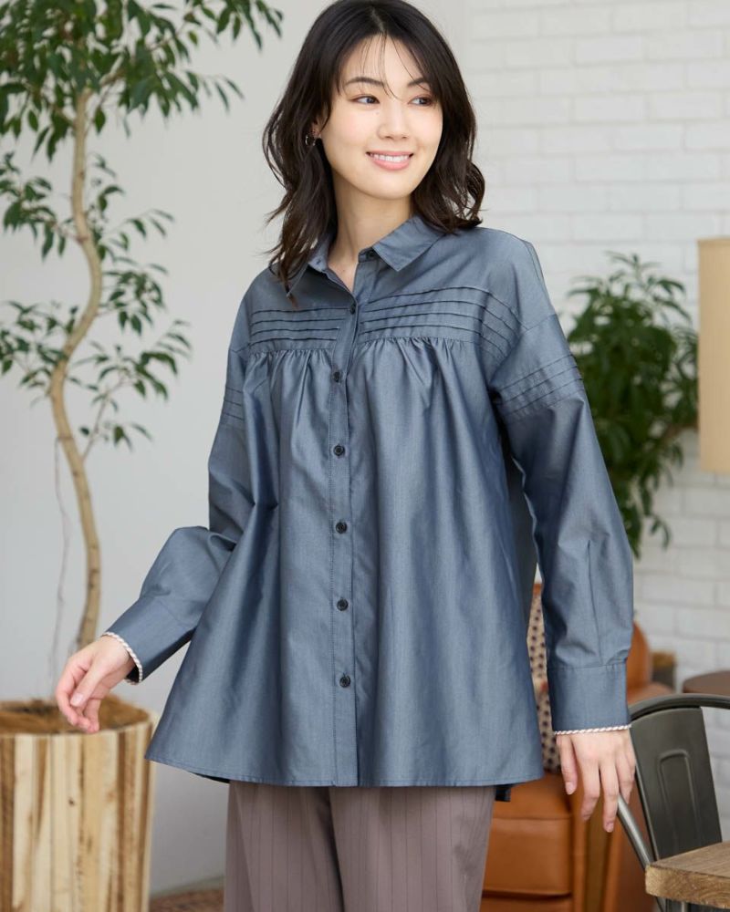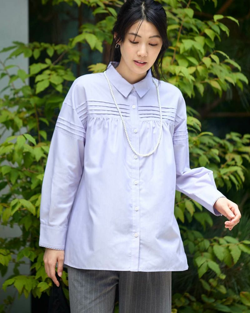 細かいツイルに織った生地は、ほのかなツヤ感でキレイ見え抜群なアイテム。しなやかさもあるため、強張りを気にせずお召しいただけます。白い糸を用いて織っているため発色も柔らかくベーシックカラーとも馴染みやすいです。フロントに施したピンタックに、ほどよい甘さと華やかさがあり1枚着もしっかりと担います。襟が付いていて、きちんと感もあるのでスラックスを合わせてオフィスや学校行事での着用も可能。寒さが増したら、トレンドのファーべストやローゲージのニットを重ねてカジュアルダウンしても可愛くておすすめです。