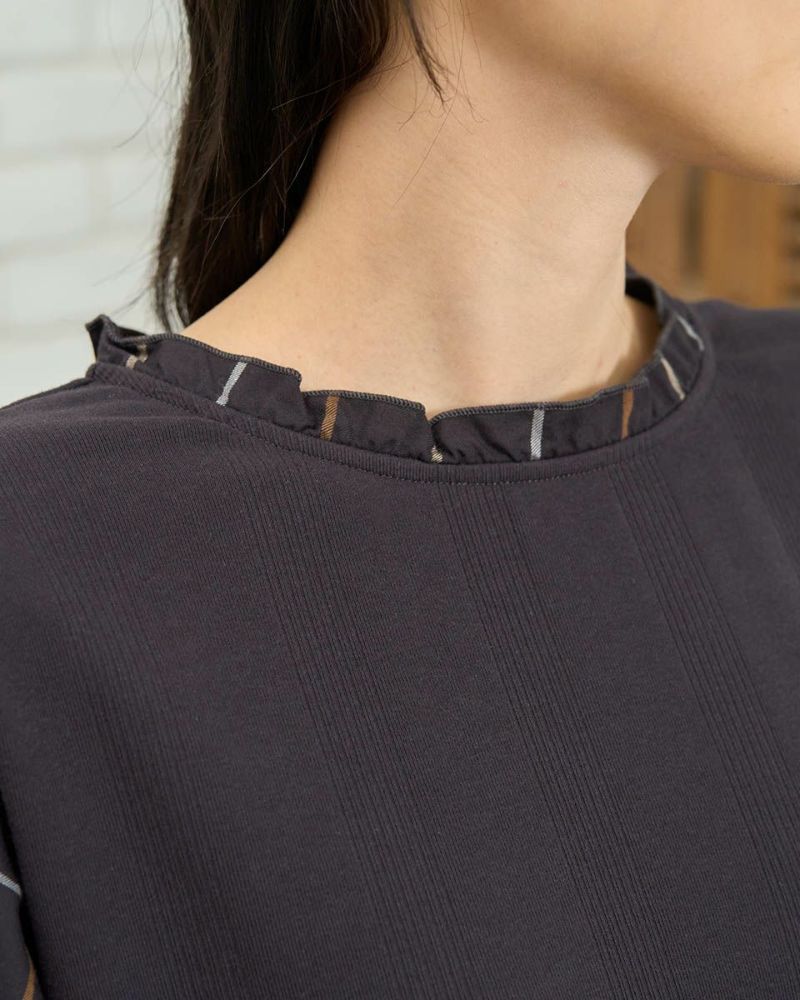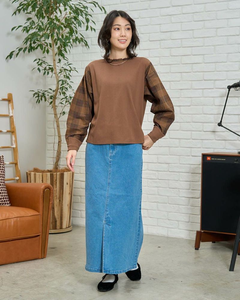 タテ方向の太いラインと細いラインが交互に編まれた変形フライスを身頃に用いた布帛ドッキングのデザインプルオーバー。チェック生地であしらった袖は、袖山のラインにカーブを付け膨らみを出しているため、トラッドだけでは終わらずモード感も含んだアイテムです。袖口をたくし上げ袖をたゆませる着方も雰囲気があっておすすめ。気温に応じてファーベストを羽織るレイヤードスタイルも素敵です。ほどよく落ちる肩のラインは砕け過ぎずオフィスでの着用も可能。レザーやファー、デニムなど様々な質感のアイテムと合わせるとより洗練されて見えるのでお試しください。