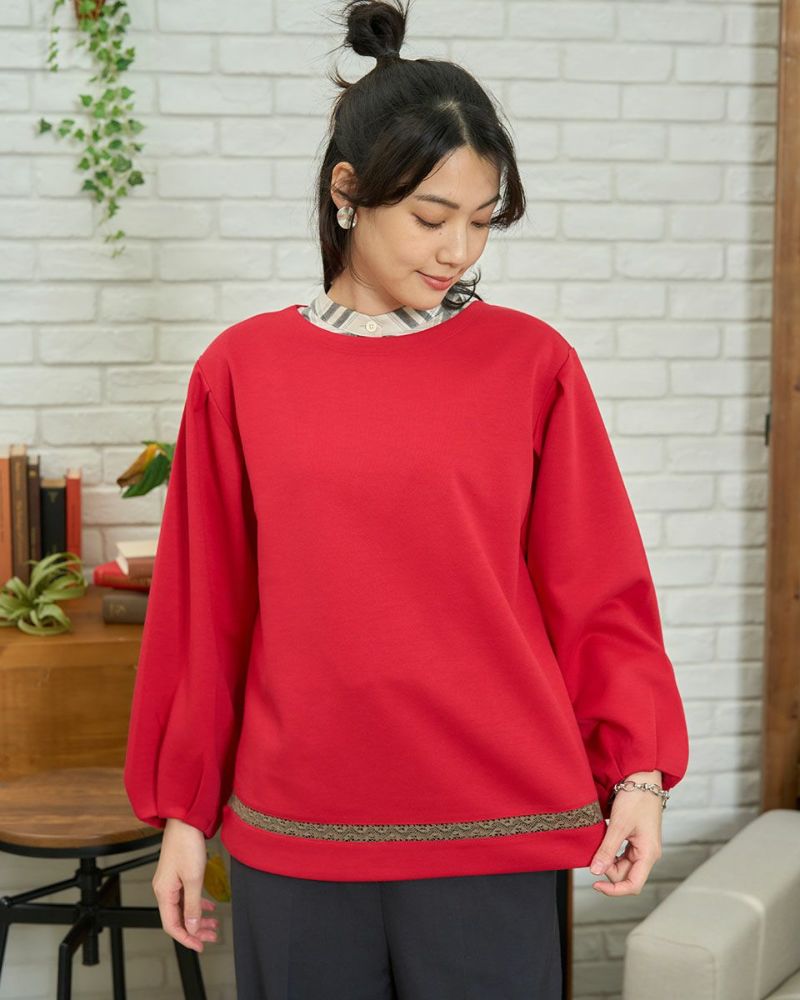 綿ポリエステルを使ったダブルフェイスのカットソーは、キメの整った編地の肌触りがソフトで滑らか。ヨコ方向のテンションに優れ、ほどよい弾力も魅力です。親しみやすいAラインのボディに、ふんわりと膨らむ袖のディティールが華やかなプルオーバー。裾に施したレースは控えめですが品の良さが伺えるポイントです。ロンTよりも肉厚で裏毛より薄手な生地感で気温の定まらないシーズンでも、しっかり1枚着をお楽しみいただけます。トレンドのブラウンカラーにゴールドジュエリーで光を添えた着こなしも素敵です。使いやすいため色違いでのお買い求めもおすすめ。 モデル身長: 166 cm 着用サイズ: M サイズ Golden Bear White Label (WOMEN) カットソー (WOMEN) 【着用アイテム】467RD334 チェックネルシャツ 468R4760 サスペンダーパンツ 468RC751 デニムスカート