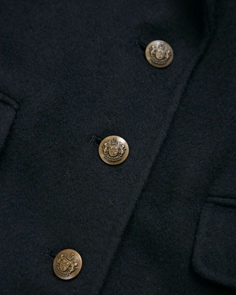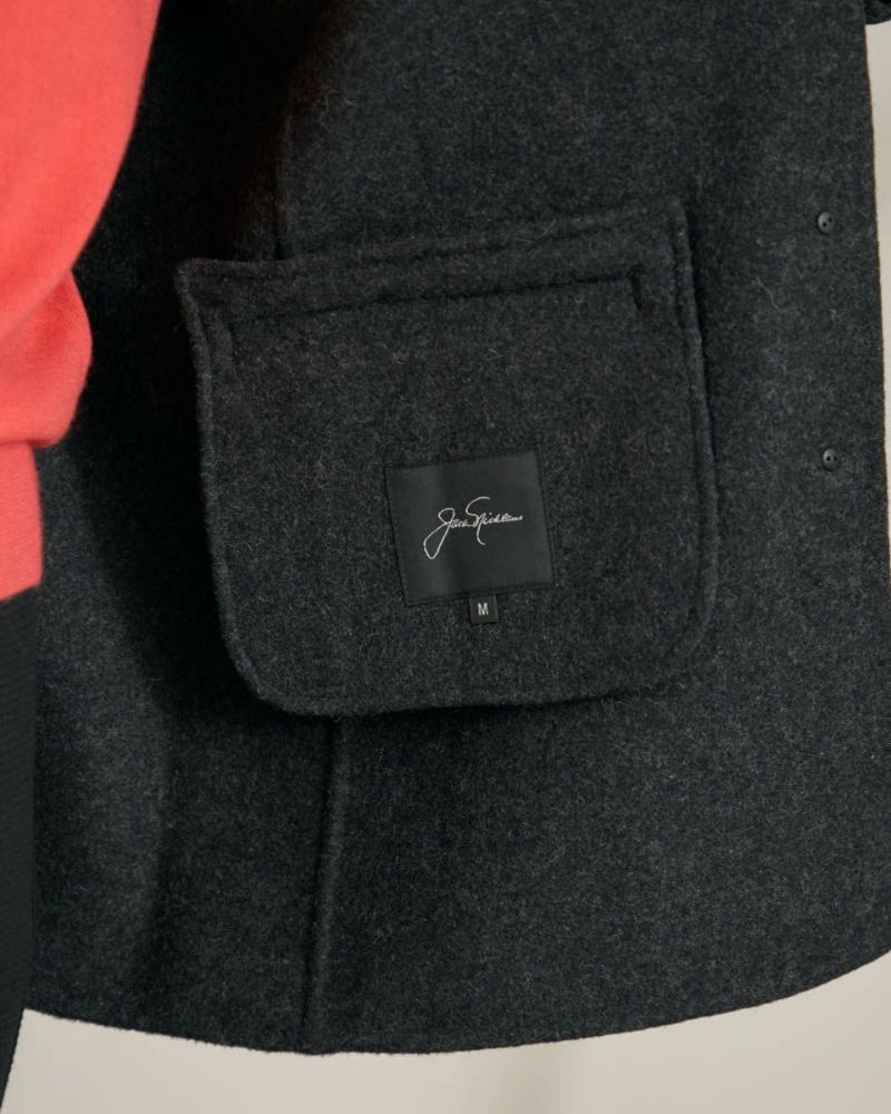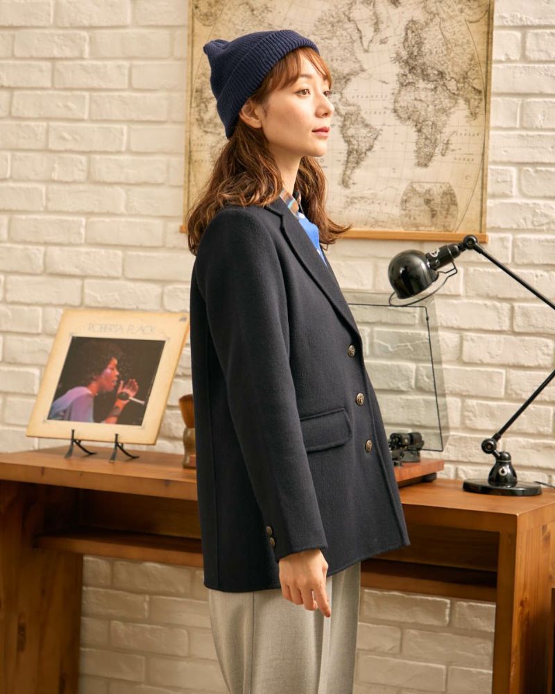 ウール混の二重織素材を使用し、一枚仕立てに仕上げたテーラードジャケットです。(二重織とは:2枚の生地を重ねて1枚に仕上げる織り方の事です。コートやタオル等ふわふわとした素材の物に使われる事が多く、柔らかさと保温性の高さが特徴です)アンティックゴールドの釦がポイントで、同色染をしたベーシックな釦も1セット付けていますので、お好みで釦をアレンジできます。袖のみ滑りが良い様に裏地を付けています。色はトップグレーとネイビーの2色です。 モデル身長: 171 cm 着用サイズ: M サイズ Jack Nicklaus (Ladies') アウター (Ladies') 【着用アイテム】467QC411 タートルネックTシャツ 467QC610 カーディガン 467QD331 チェックシャツ 467QC712 スカート 468QD750 ストレートパンツ