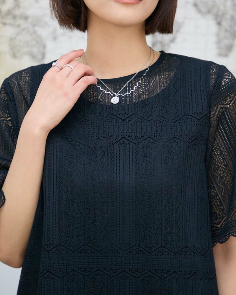 ポリエステル100%のラッセルレースを使用したブラウスです。裏地にキャミソールを付けています。デザインはノーカラーの後ろ釦開き仕様です。袖口と裾はレースの柄に合わせスカラ状にハンドカットしています。色はアイボリーとブラックの2色展開です。本体とキャミソールは取り外し可能です。