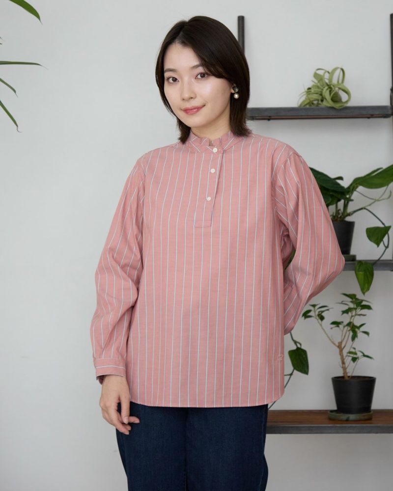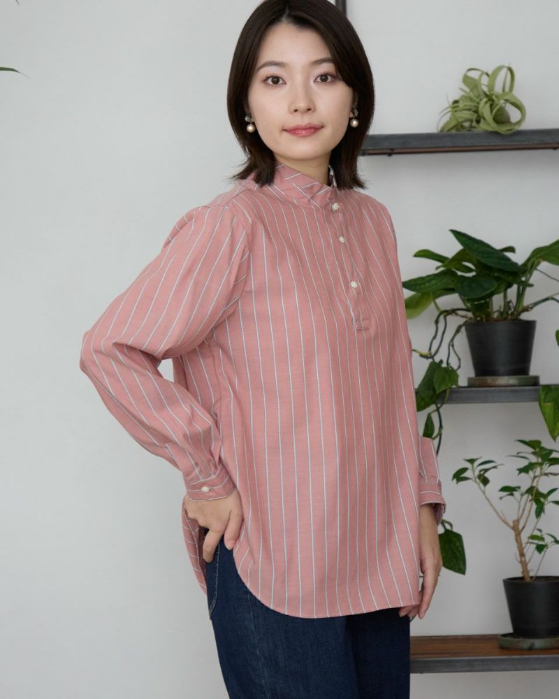 目の詰まったカジュアル過ぎない素材を使用したプルオーバーブラウスです。ひねりの効いたスタンドカラーがすっきりとクリーンな印象です。1枚でシンプルに着用してもサマになる1枚です。 モデル身長: 162 cm 着用サイズ: M サイズ Golden Bear QUEEN SIZE(Ladies' 大きいサイズ ) ブラウス (Ladies') 同デザイン通常サイズはこちら