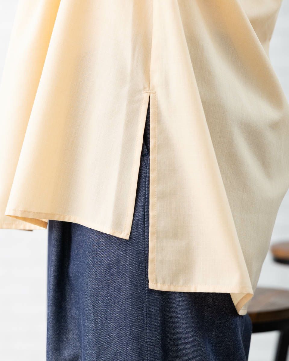 癖が無くプレーンで清潔感のある平織りの生地を使用。ネックから胸上まで半円状に3段に切り替えたパーツにピンタックやギャザーを施した手しごと感が感じられるブラウス。生地が細かく隆起し表情が吹き込まれた上半身が華やかなため首元がスッキリと映るようにバンドカラーにしています。ほのかに透け感があり軽く涼しげなので春夏を通して長くお召しいただけます。腹部やヒップを覆う着丈で便利なアイテム。 モデル身長: 168 cm 着用サイズ: M サイズ Golden Bear White Label (WOMEN) ブラウス (WOMEN) 【着用アイテム】468R4660 バックペプラムプルオーバー 468R3760 ストレートパンツ 468R4760 サスペンダーパンツ