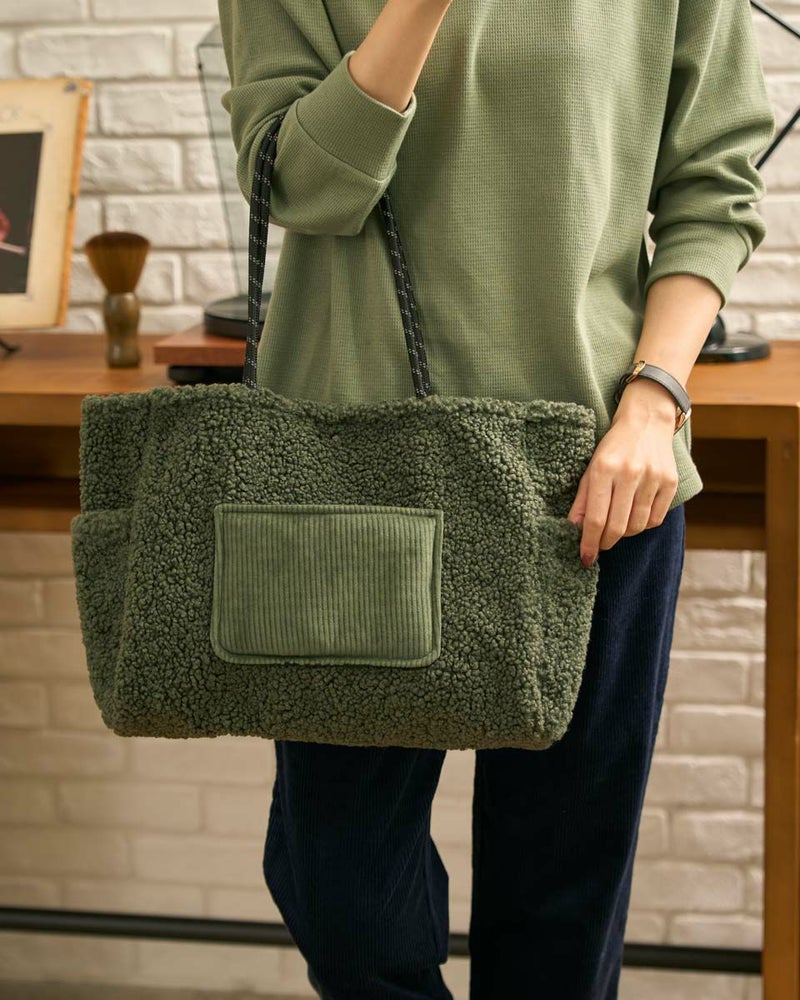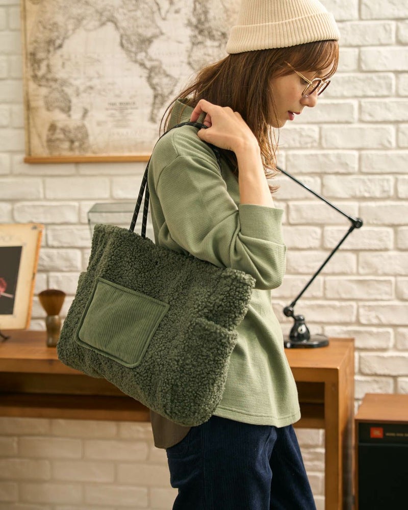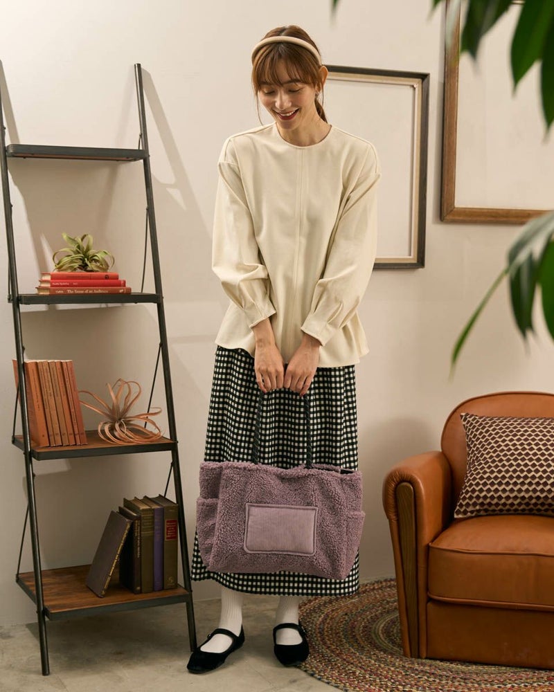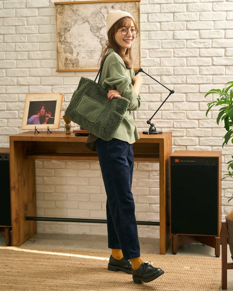 ボアの本体にコーデュロイのポケットを配置した大きめのトートバッグ。寒い季節にぴったりのデザインでコーディネートのポイントになります。 Golden Bear WOMEN アクセサリ (WOMEN) 【着用アイテム】467QC410 ワッフルTシャツ 468QD361 ブラウス 467QD701 1タックテーパードパンツ 468QD751 スカート