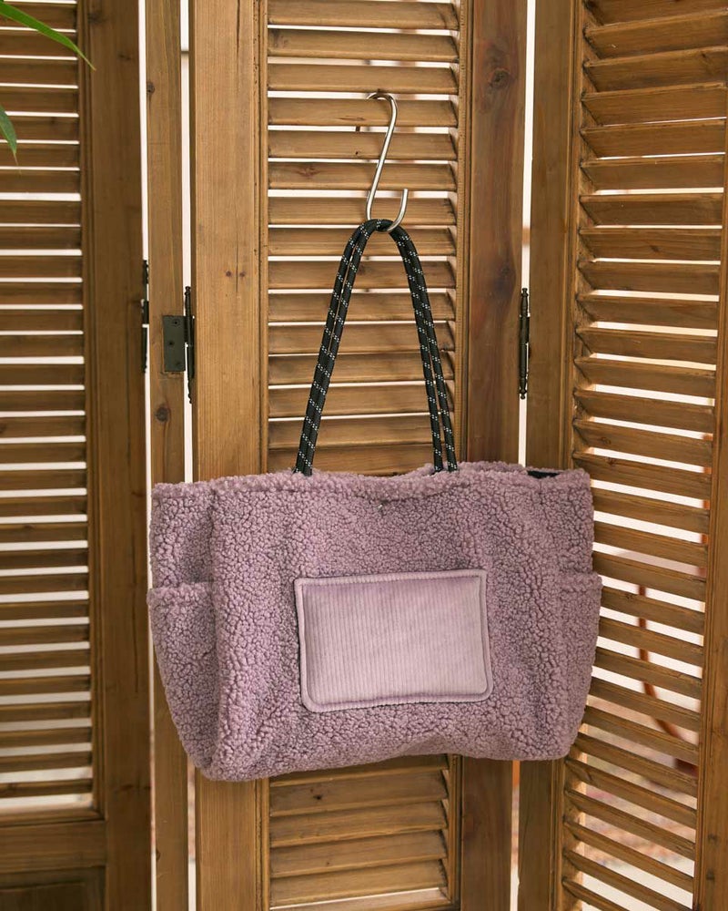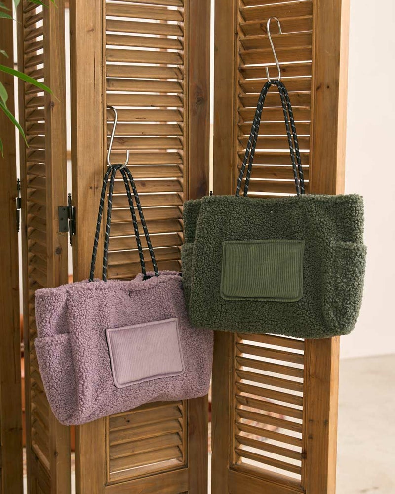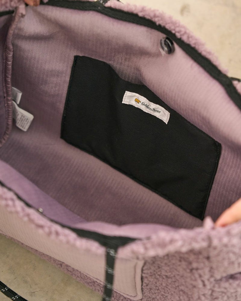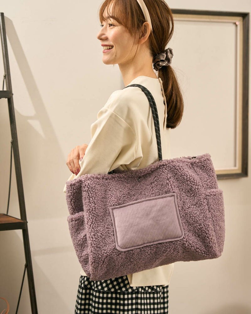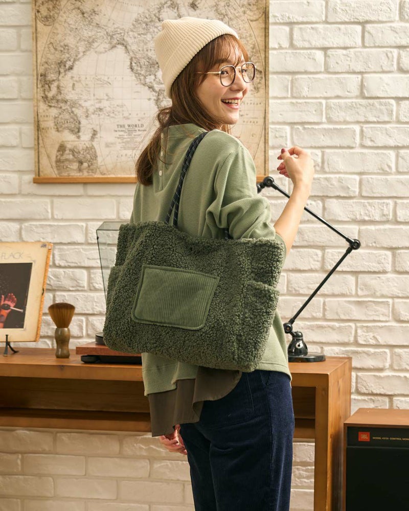 ボアの本体にコーデュロイのポケットを配置した大きめのトートバッグ。寒い季節にぴったりのデザインでコーディネートのポイントになります。 Golden Bear WOMEN アクセサリ (WOMEN) 【着用アイテム】467QC410 ワッフルTシャツ 468QD361 ブラウス 467QD701 1タックテーパードパンツ 468QD751 スカート